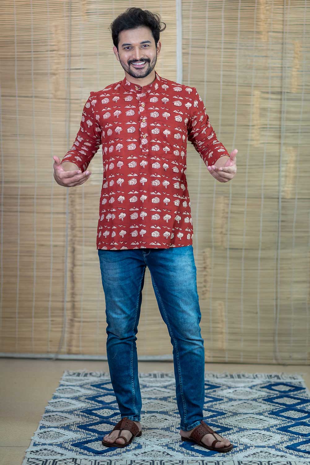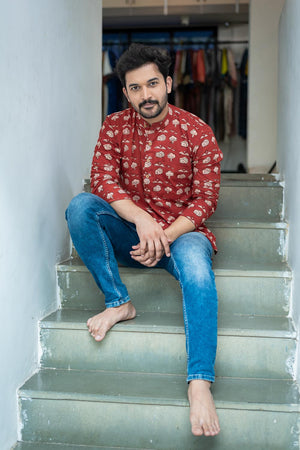 Rush Me Fashion’s very own collection of Handblock printed Mens Kurtas. Signature Collection – 'Bachpan' cotton short kurta with wooden buttons.