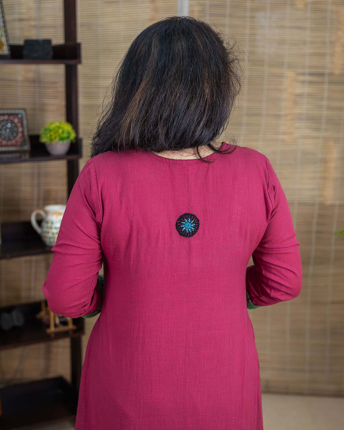 This is a special product – Rare find exclusive assorted "Lambani" hand embroidery with patchwork of contrast light firozi color, highlighted with hand embroidery. Scallop work with hand stich line for the sleeves. Applique work in the back with hand embroidery. Main fabric is our signature cotton slub. 1 side pocket. Unique color - combination.