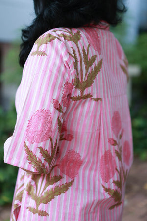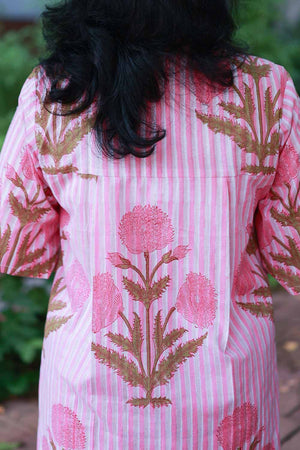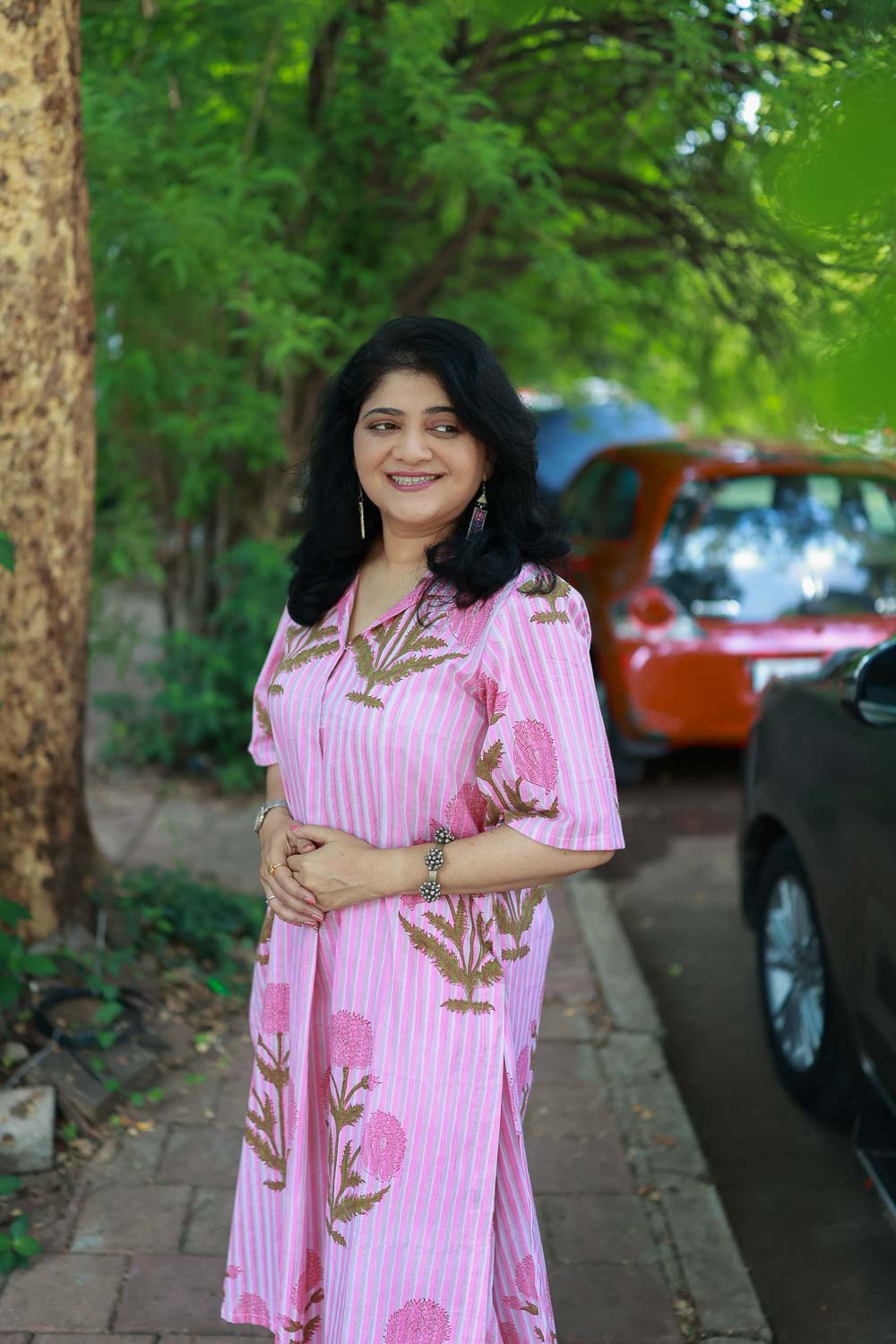Very fresh elegant pink color. Relaxed fit Pink hand block mughal butta kurta with side slits. Please note it's comfortable / relaxed fit with the pleats in the back. Do check size chart. If you order M size from our brand continue to select the same size for this fit too. If you have queries, do contact us for choosing the size. No return / exchange as per the policy. Thank you.