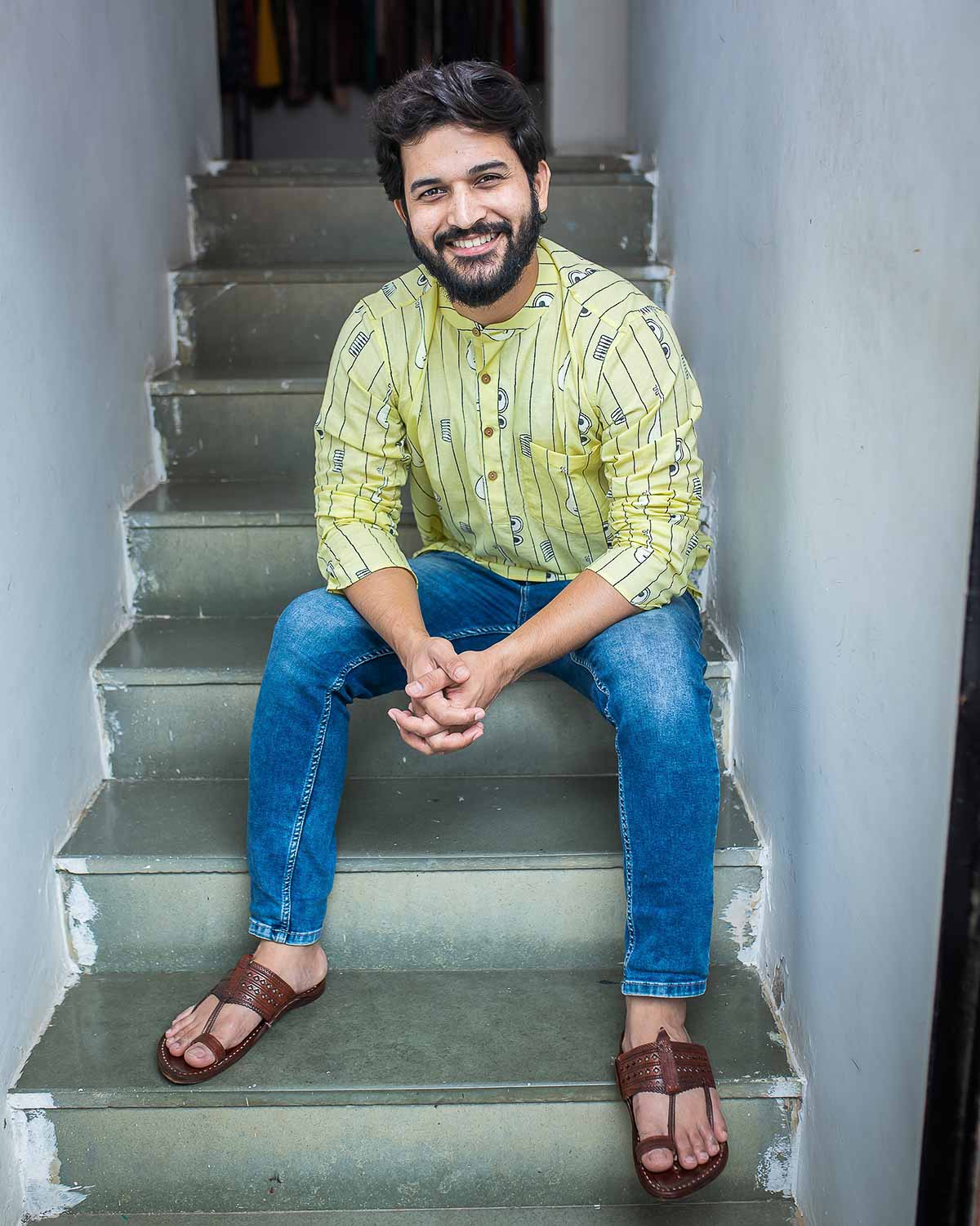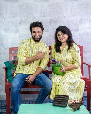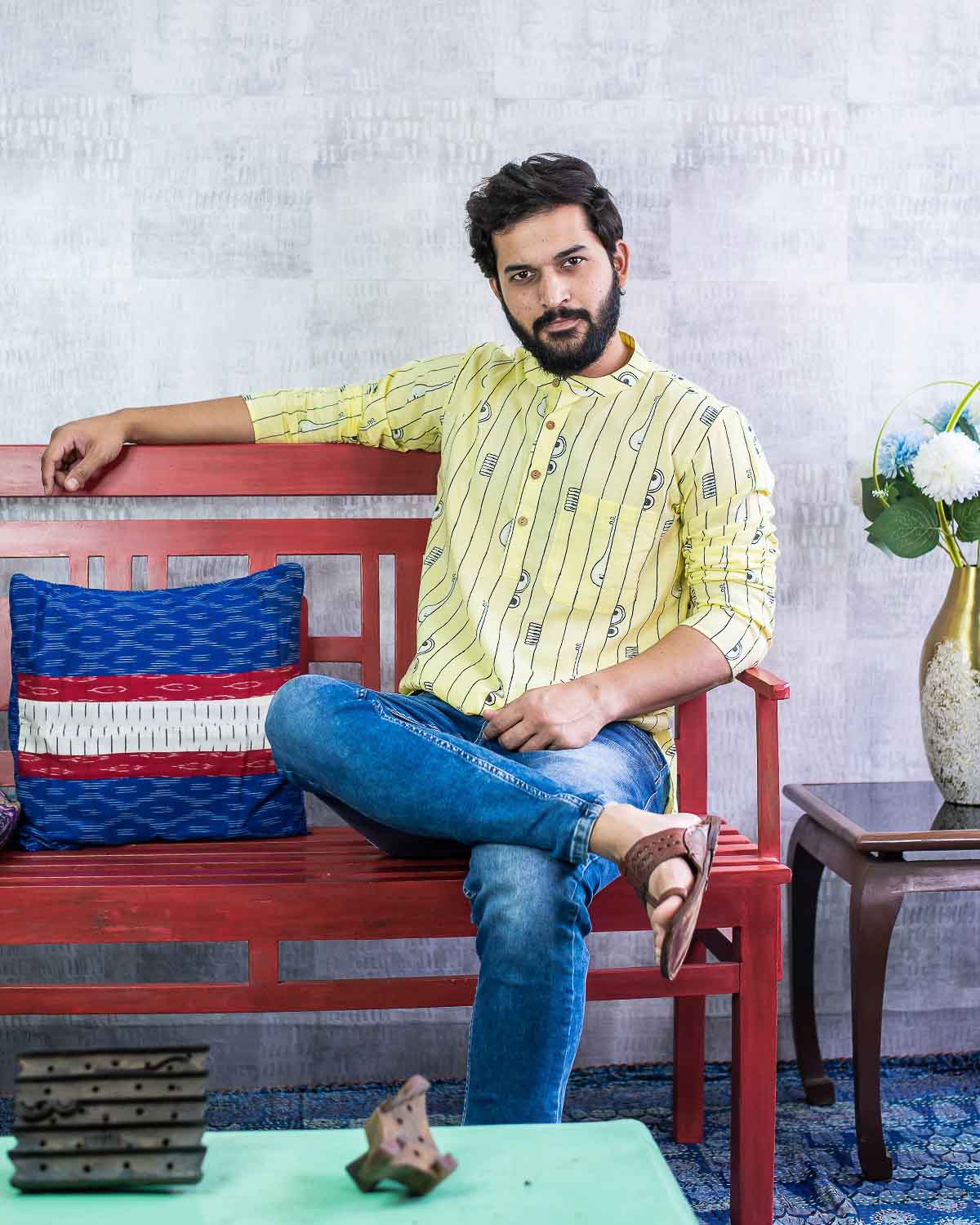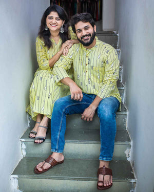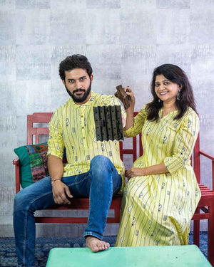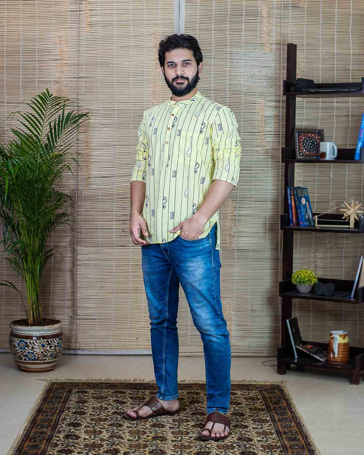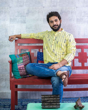 Rush Me Fashion’s very own collection of Hand block printed Men's Kurtas. Signature Collection – Bandish (Musical block print) lemon yellow cotton short kurta with wooden buttons.