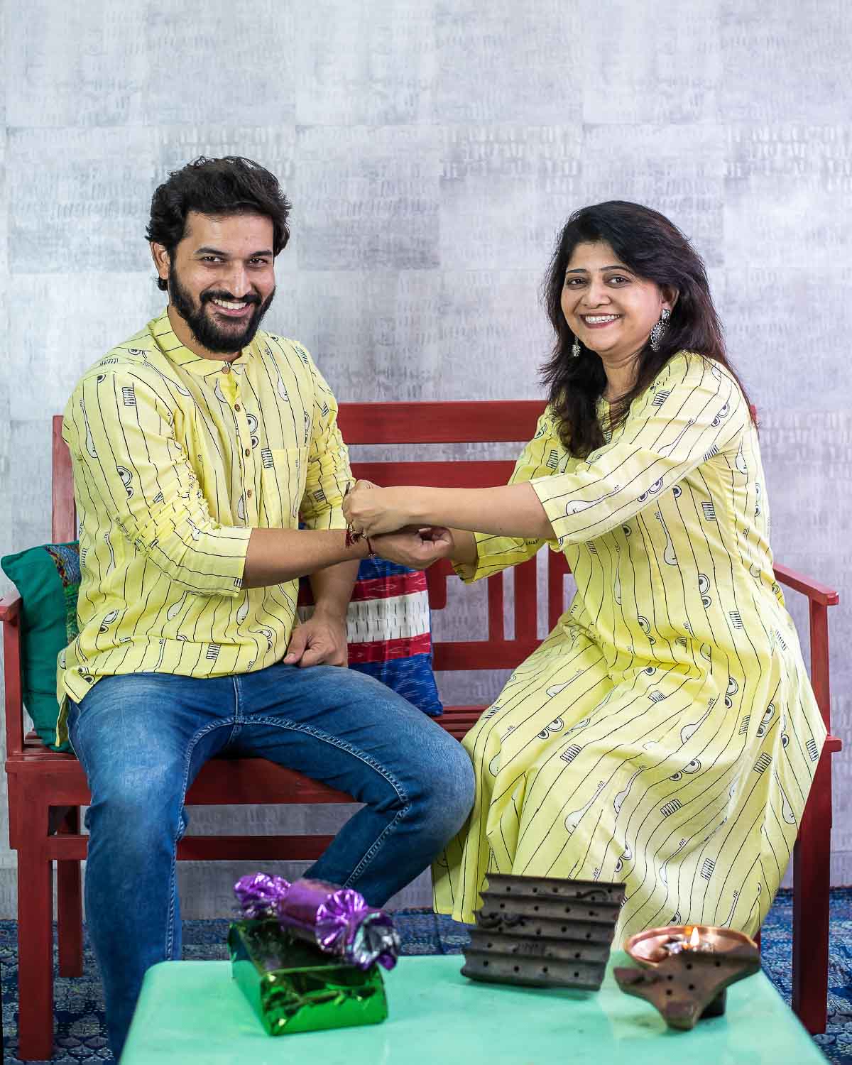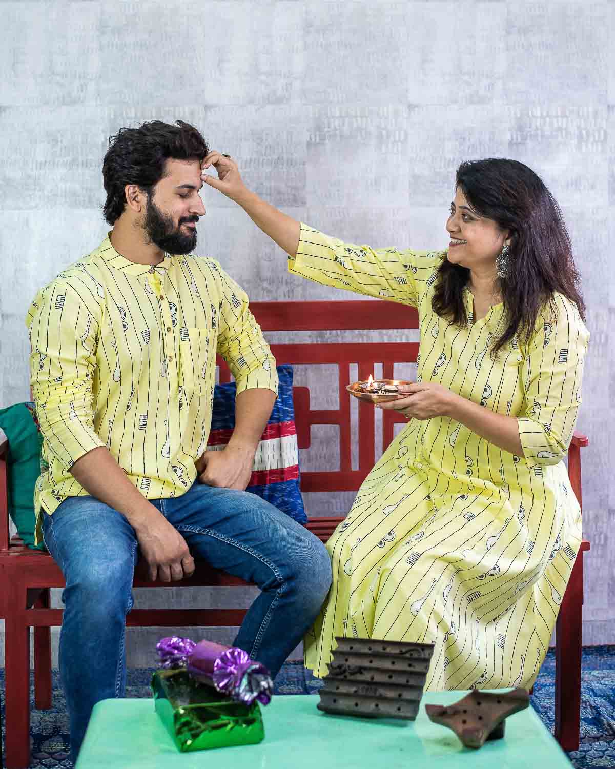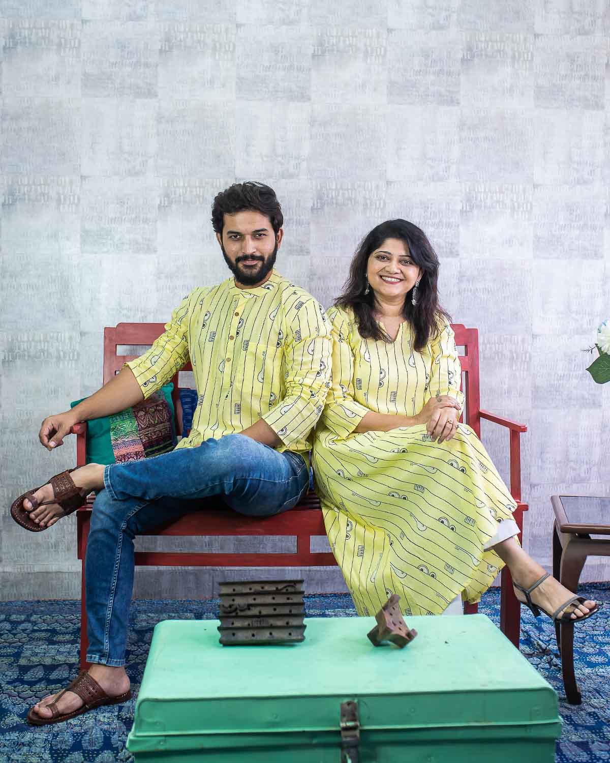 Rush Me Fashion’s very own collection of Hand block printed Men's Kurtas. Signature Collection – Bandish (Musical block print) lemon yellow cotton short kurta with wooden buttons.
