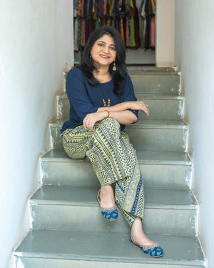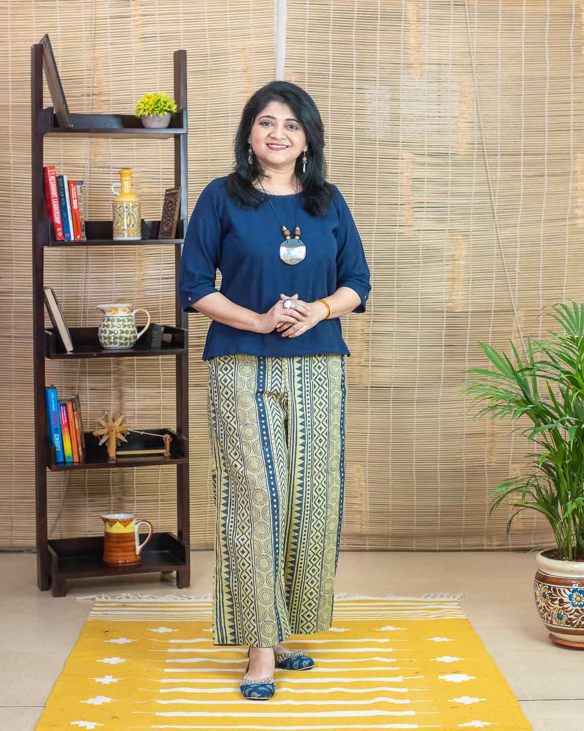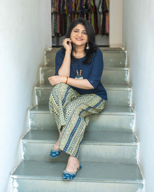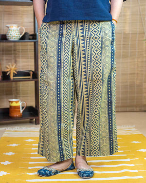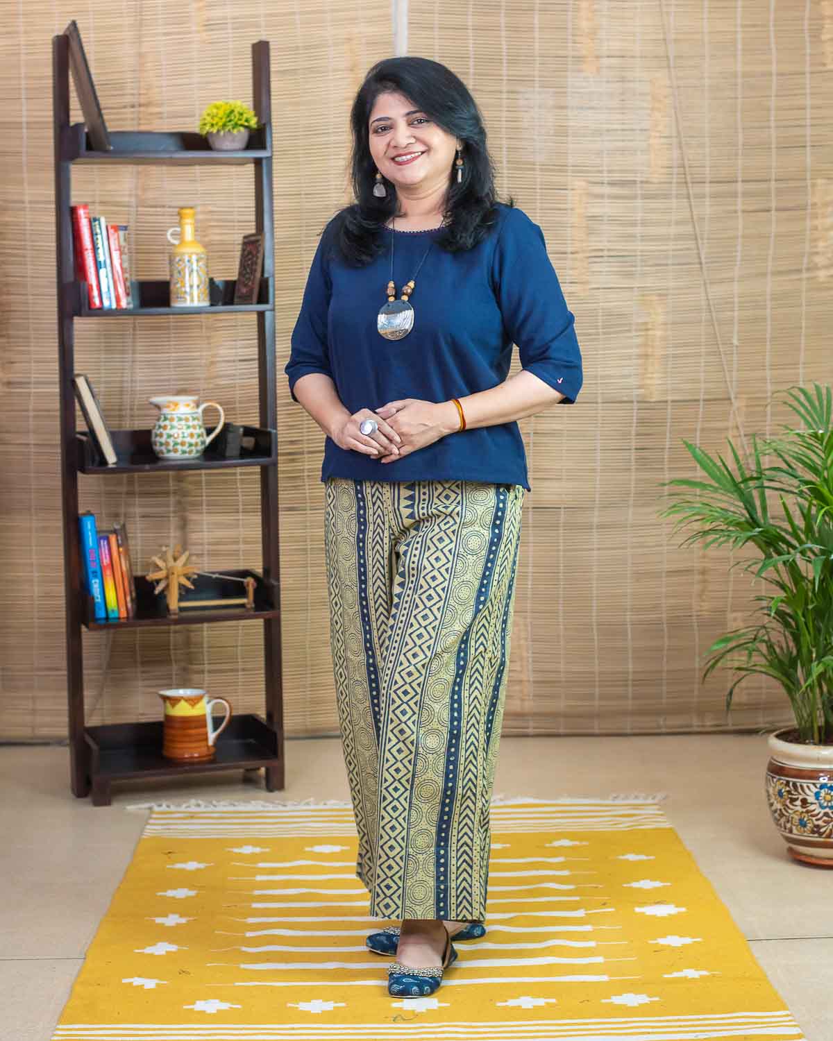 Our signature hand block print in pure cotton slub fabric. A straight pant with 1 side pocket. Comfortable & trendy. Elastic in the back, string to adjust in the front.