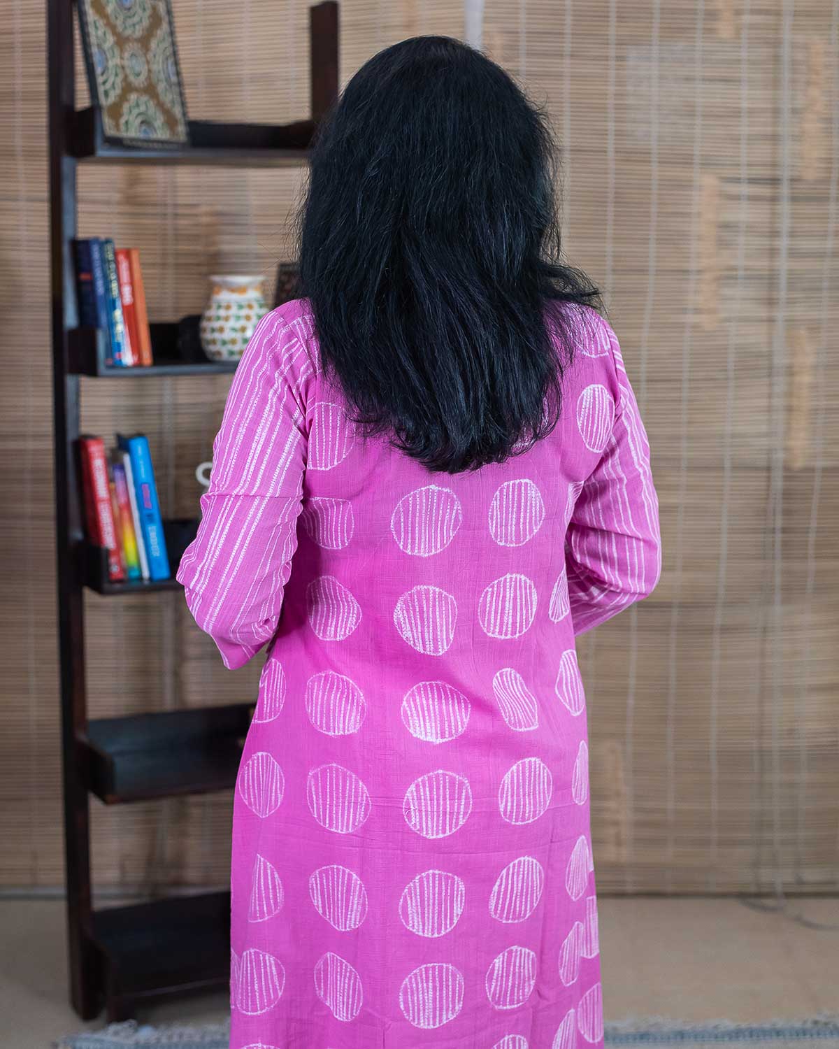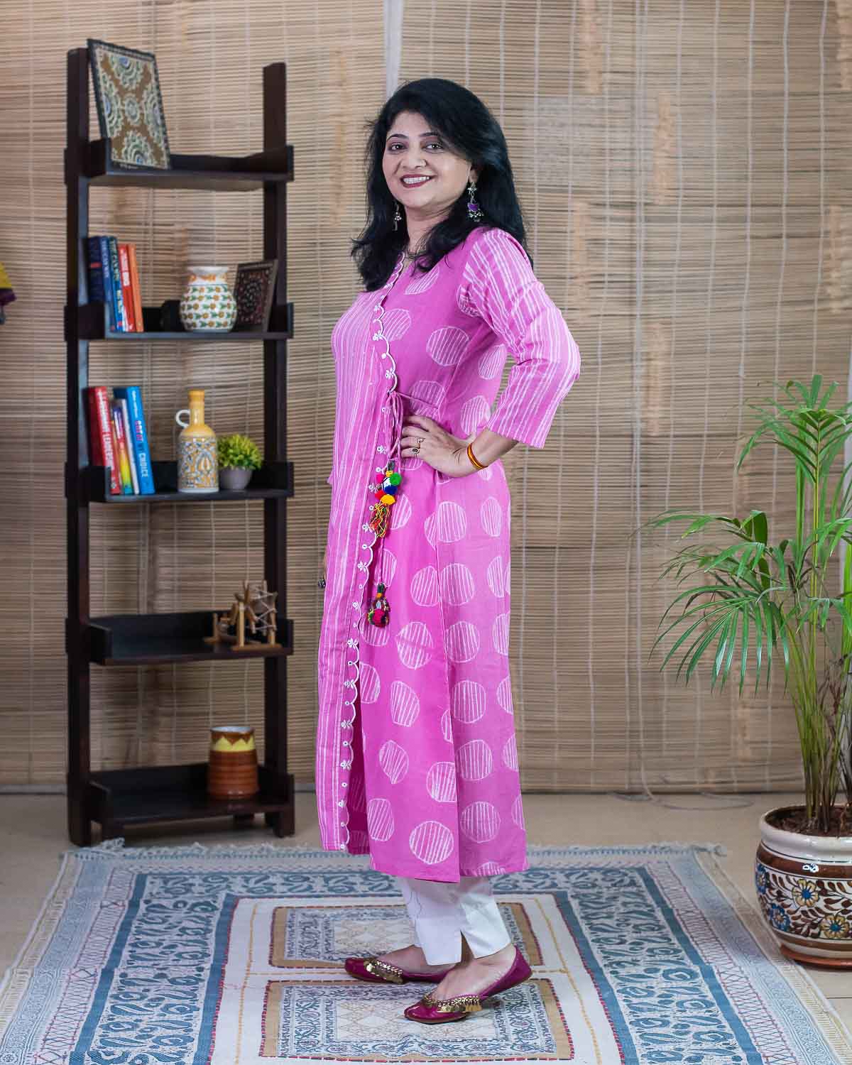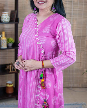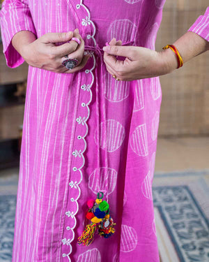 Our signature pure cotton slub fabric with Shibori tie & dye technique, alluring pink color. Overlap Pattern with 2 shibori designs and scallop with machine embroidey for the pattern. Dress/kurta with 1 side pocket. Multicolor tassels for the knot to adjust. Hand work to highlight.