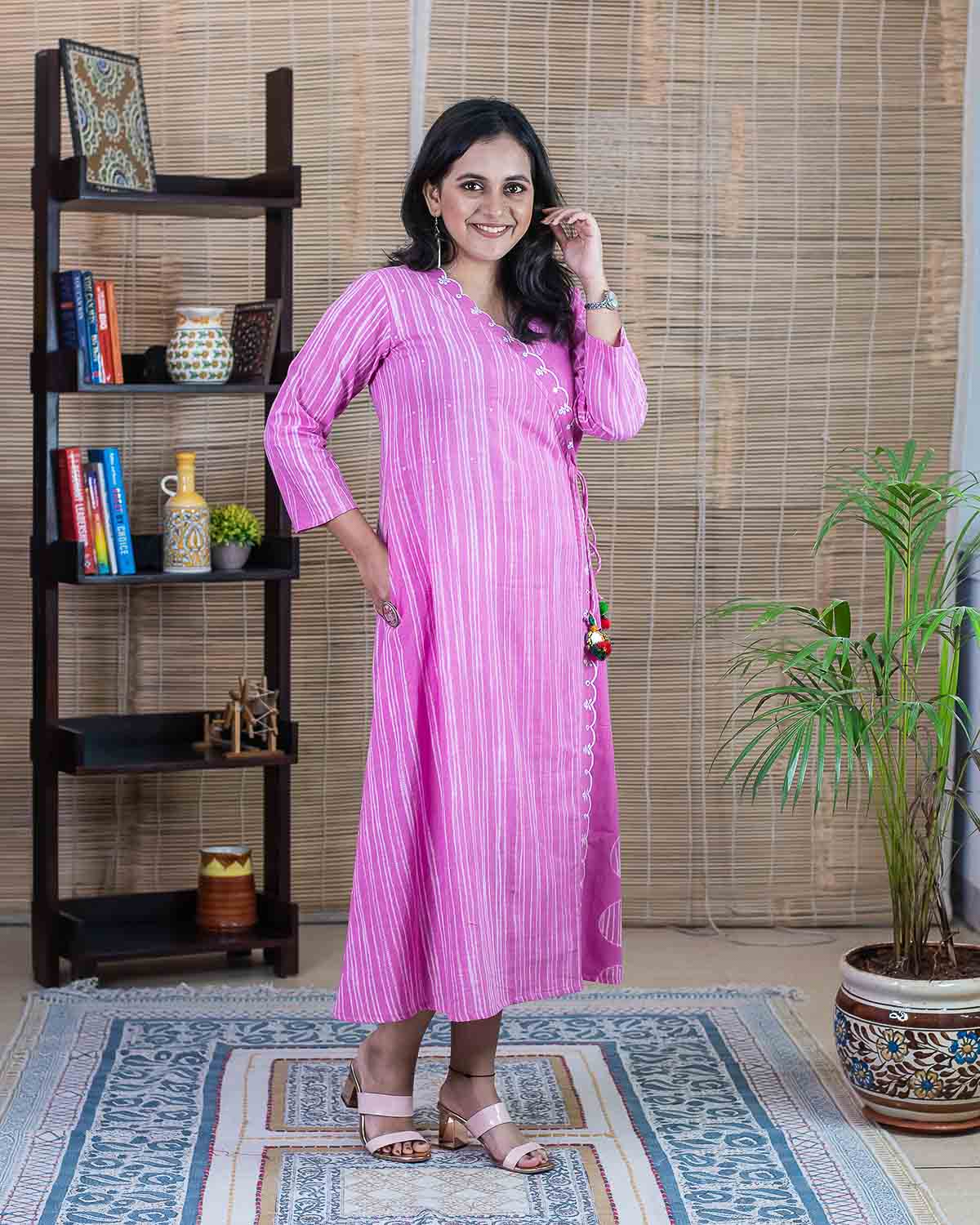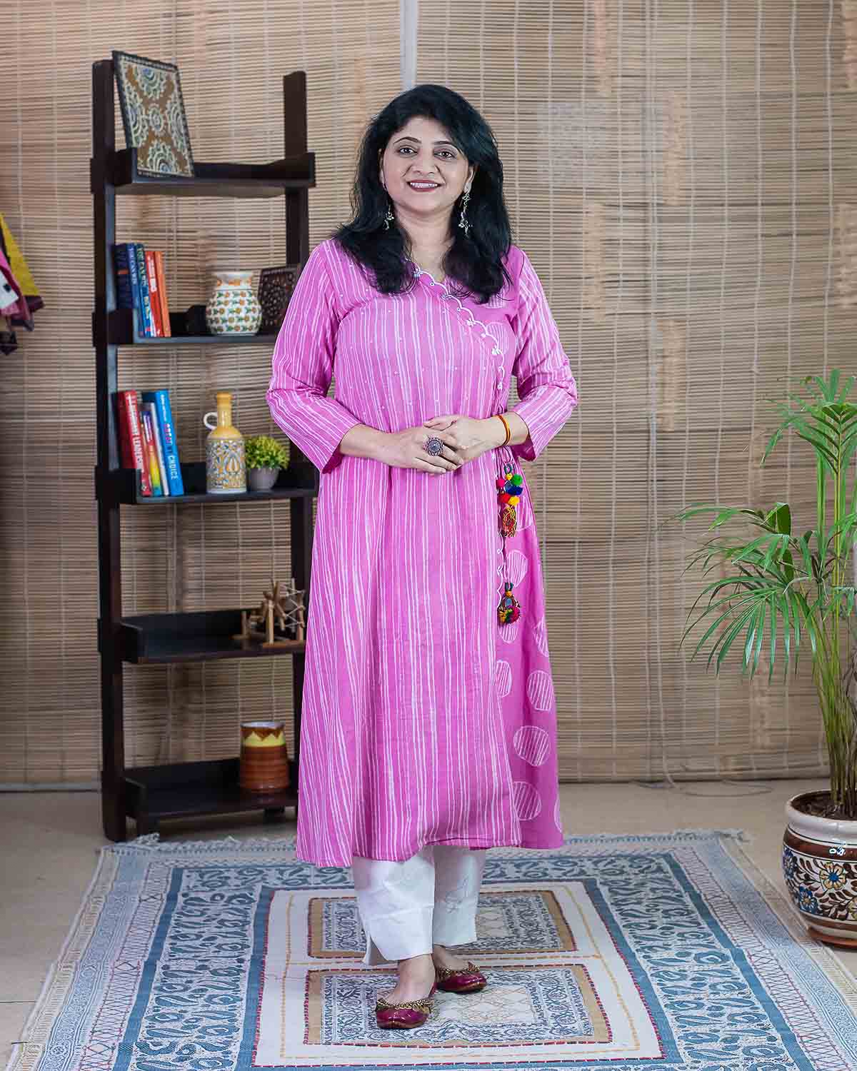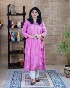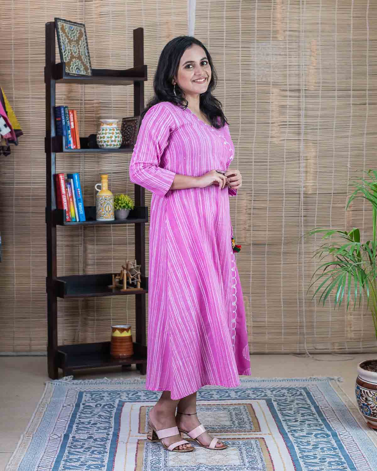 Our signature pure cotton slub fabric with Shibori tie & dye technique, alluring pink color. Overlap Pattern with 2 shibori designs and scallop with machine embroidey for the pattern. Dress/kurta with 1 side pocket. Multicolor tassels for the knot to adjust. Hand work to highlight.