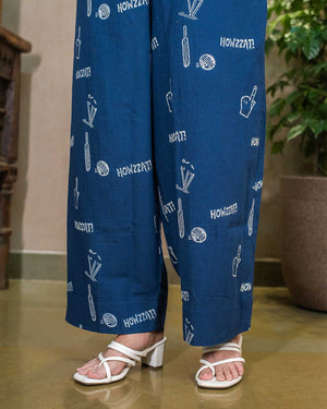 Signature print - Cricket print in Indigo color. Pure cotton superior slub fabric. A straight pant with 2 side pockets. Comfortable & trendy. Elastic in the back, string to adjust in the front.