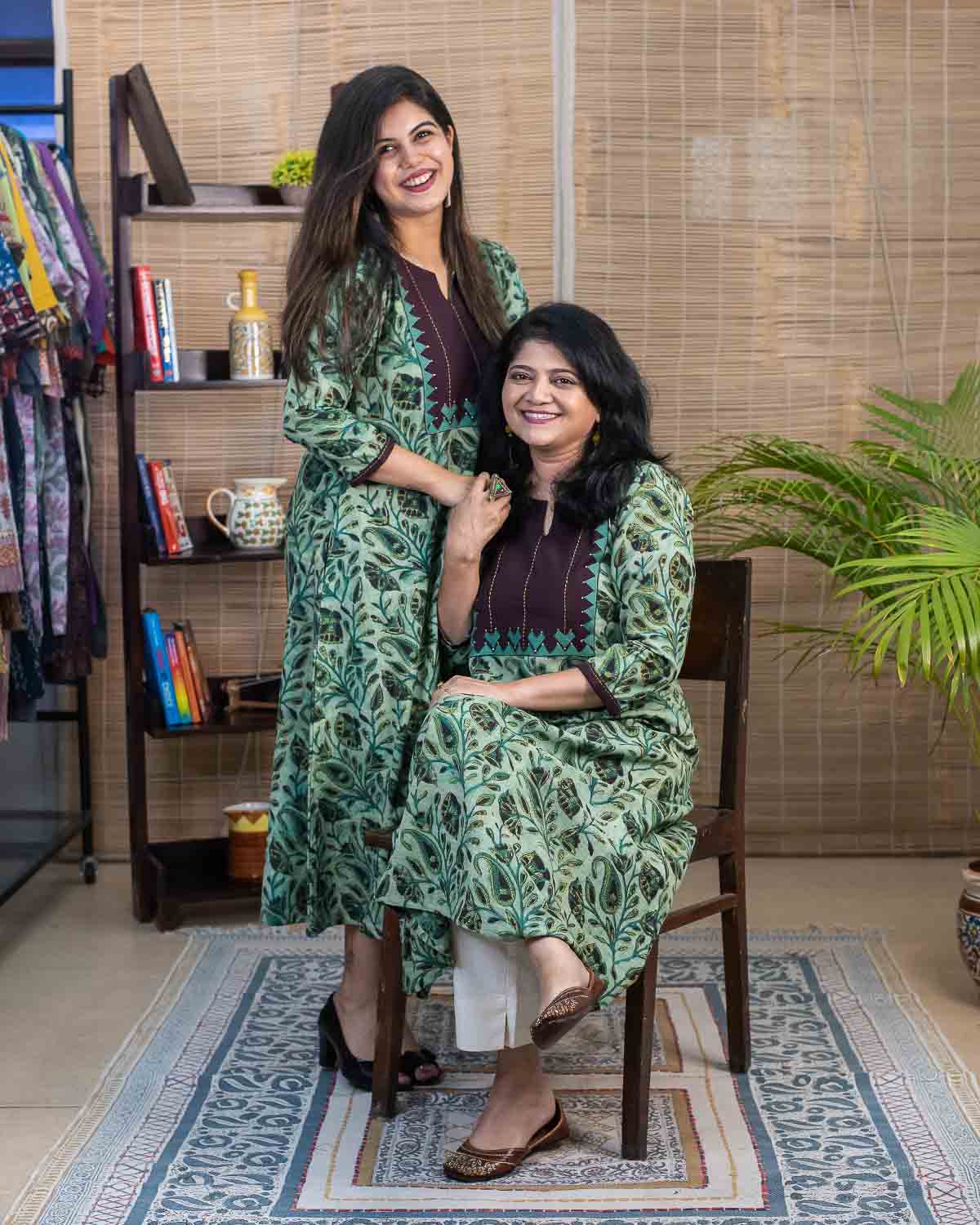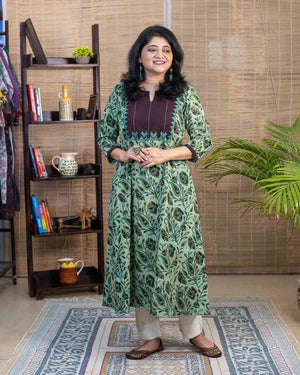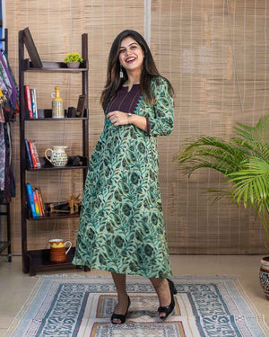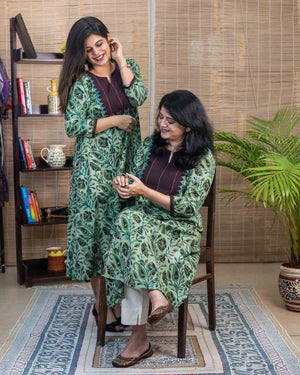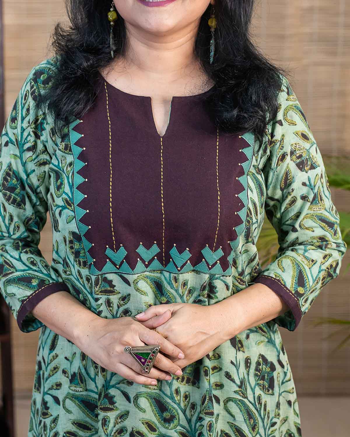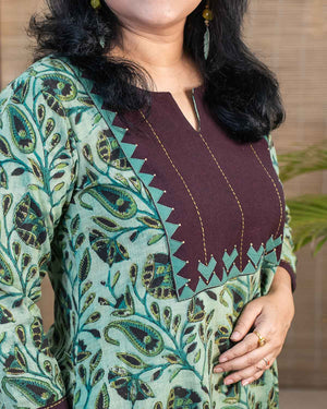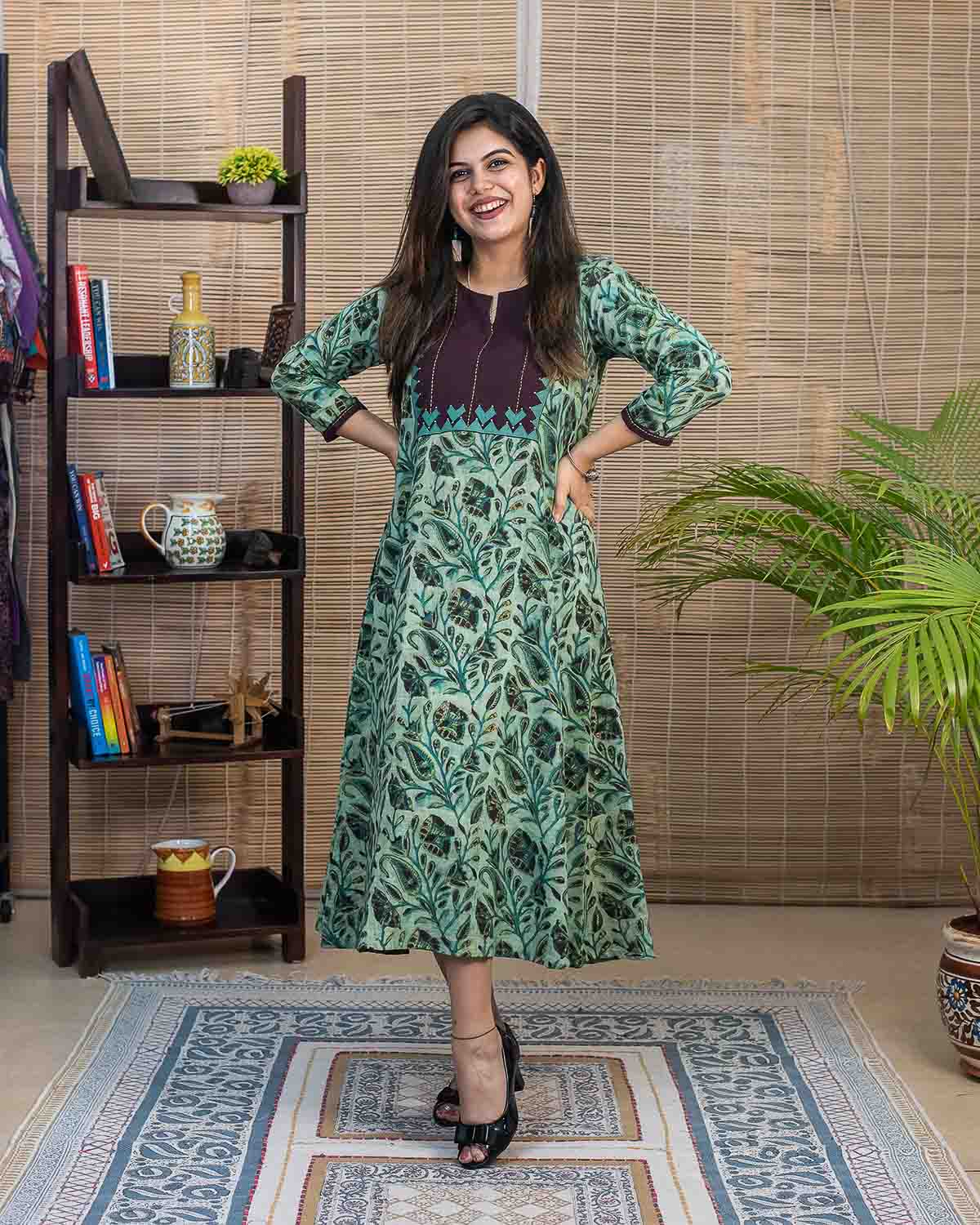 Signature slub cotton with vanaspati hand block printed fabric with contrast brown patch with applique work and handwork stich lines in the front. Dress cum Kurta with 1 side pocket. 3/4th sleeves with contrast brown border with handwork. Unique color combination.