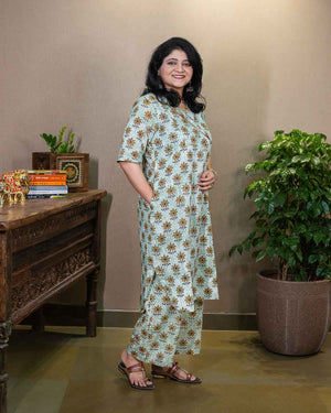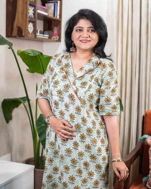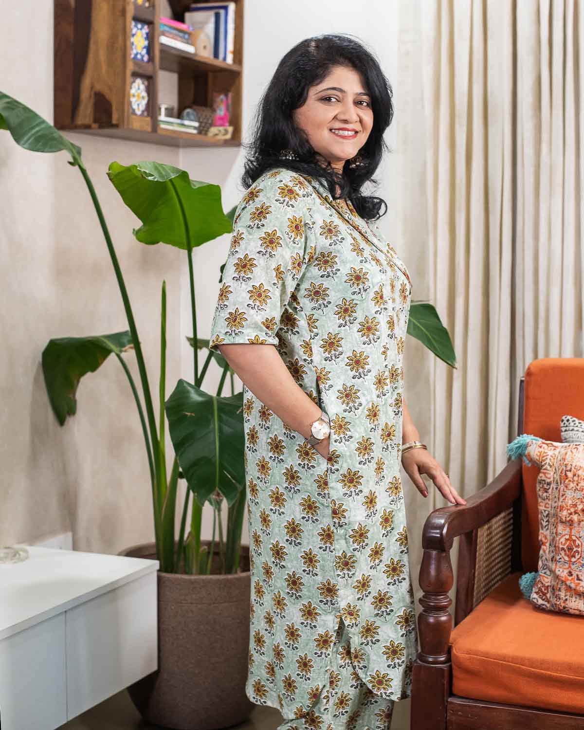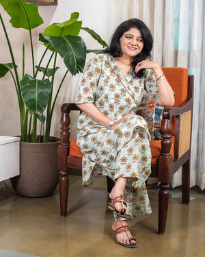 Signature fabric - pure cotton slub hand block printed straight fit kurta with side slits. Relaxed fit. Collar pattern with hand work, contrast red stitched line. You can wear this as a dress or kurta.