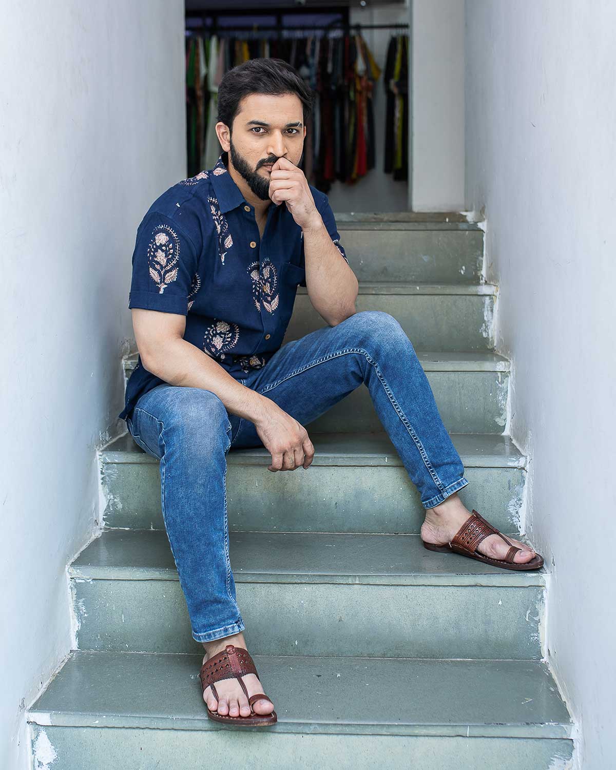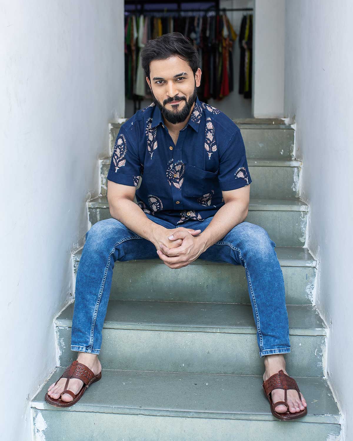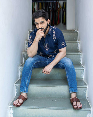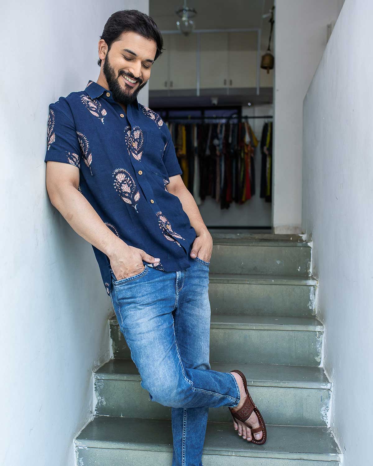Signature slub cotton fabric. Hand block printed cotton shirt with collars and wooden buttons. Pattern of borders in half body. Contrast Pattern for the sleeves.