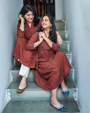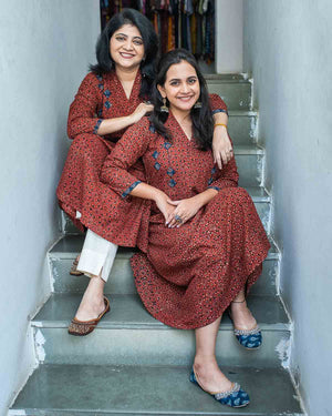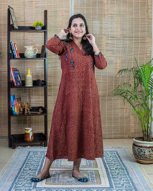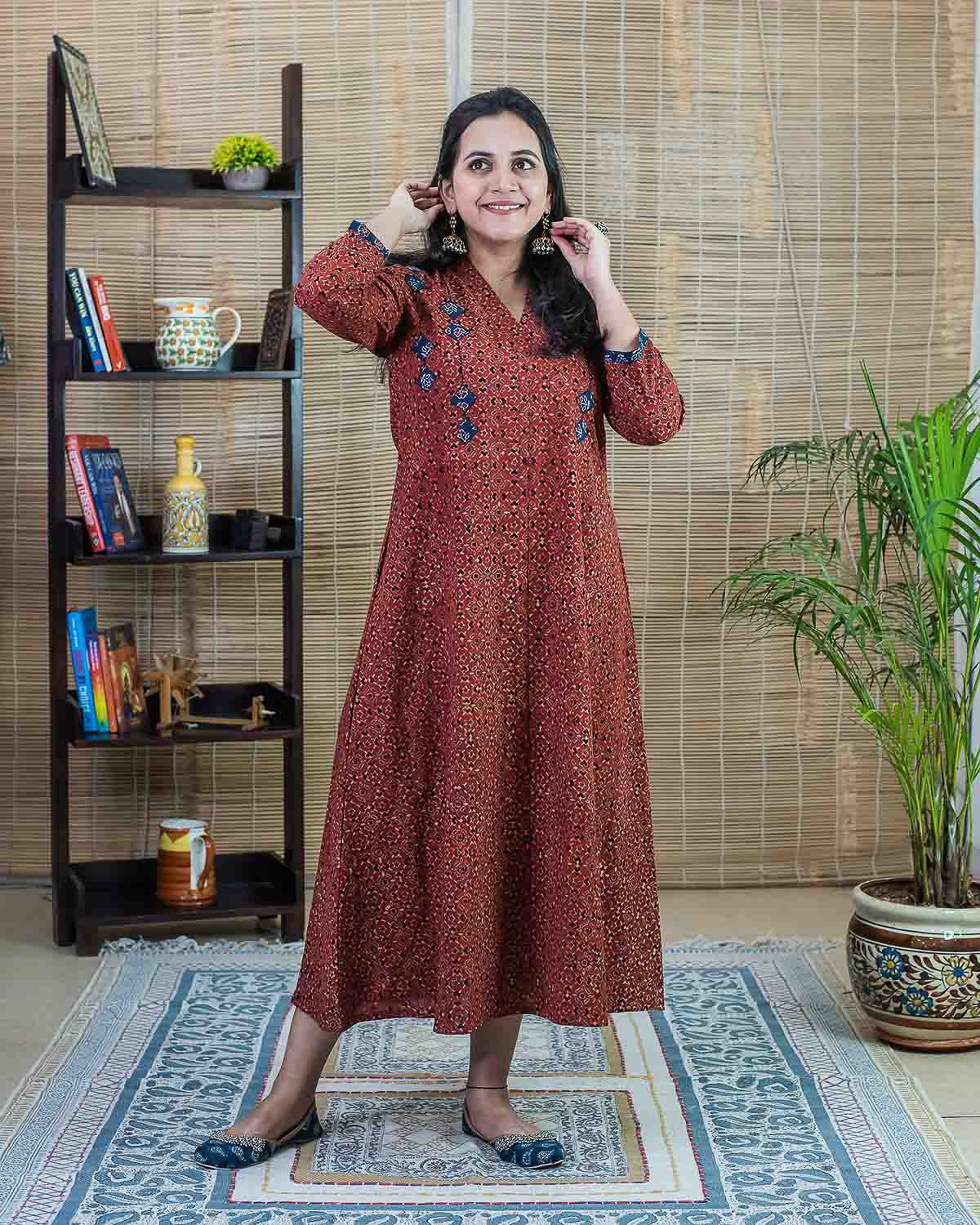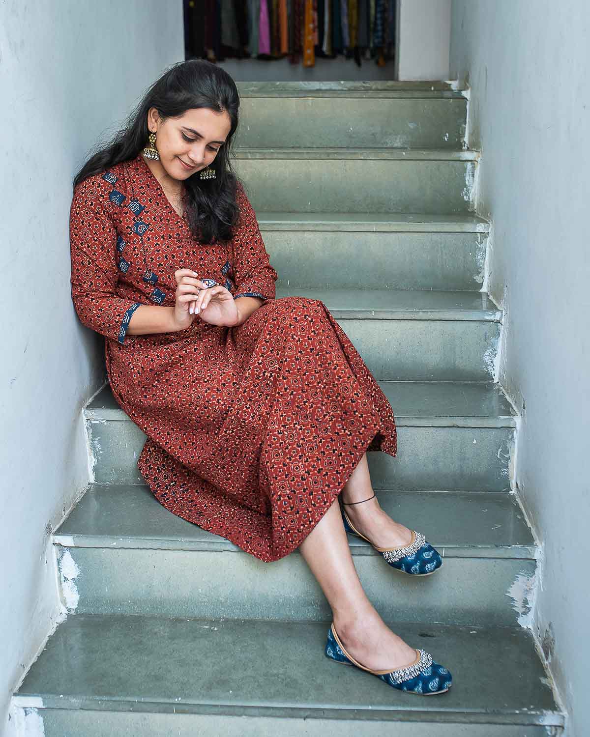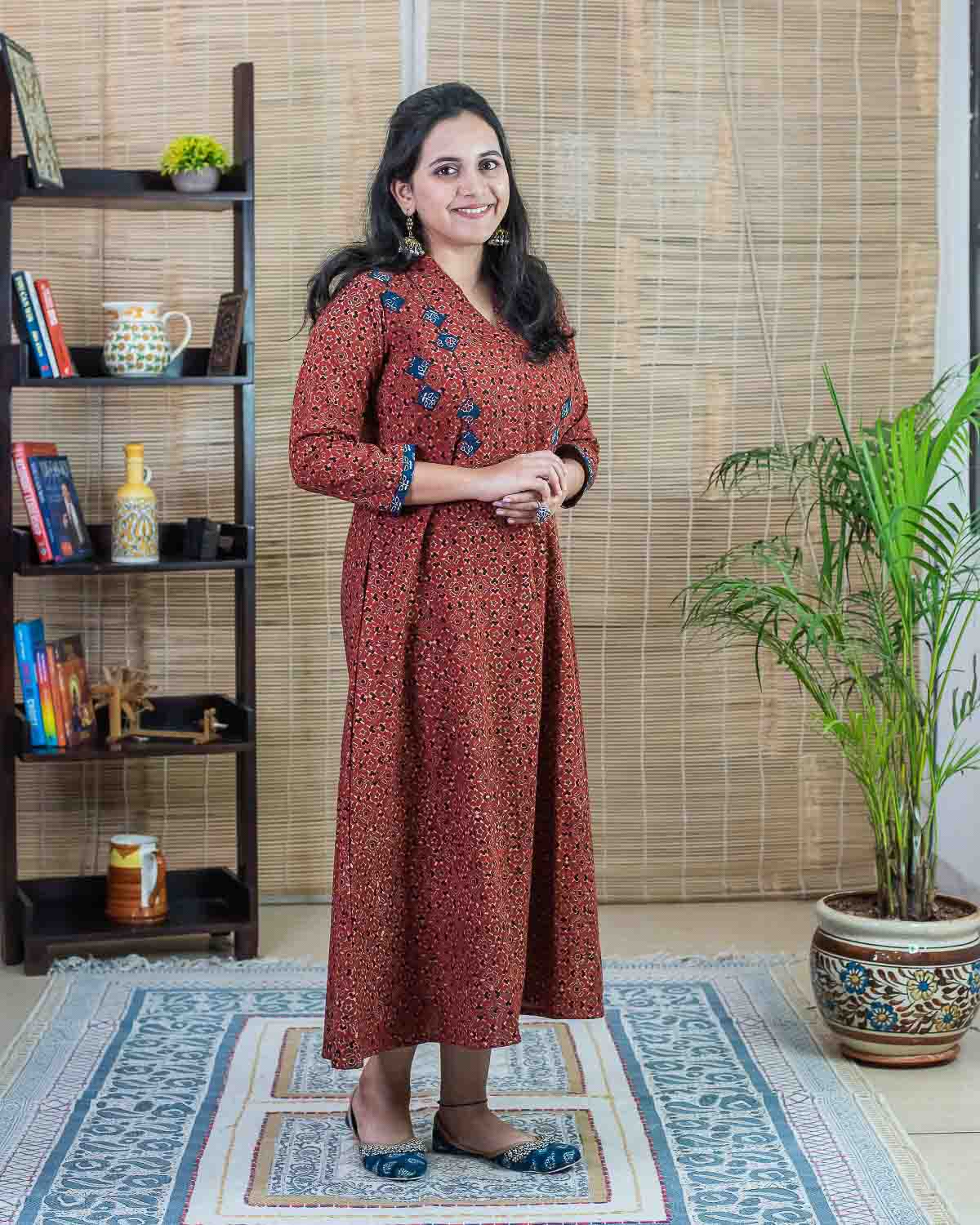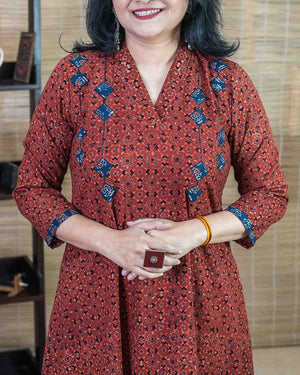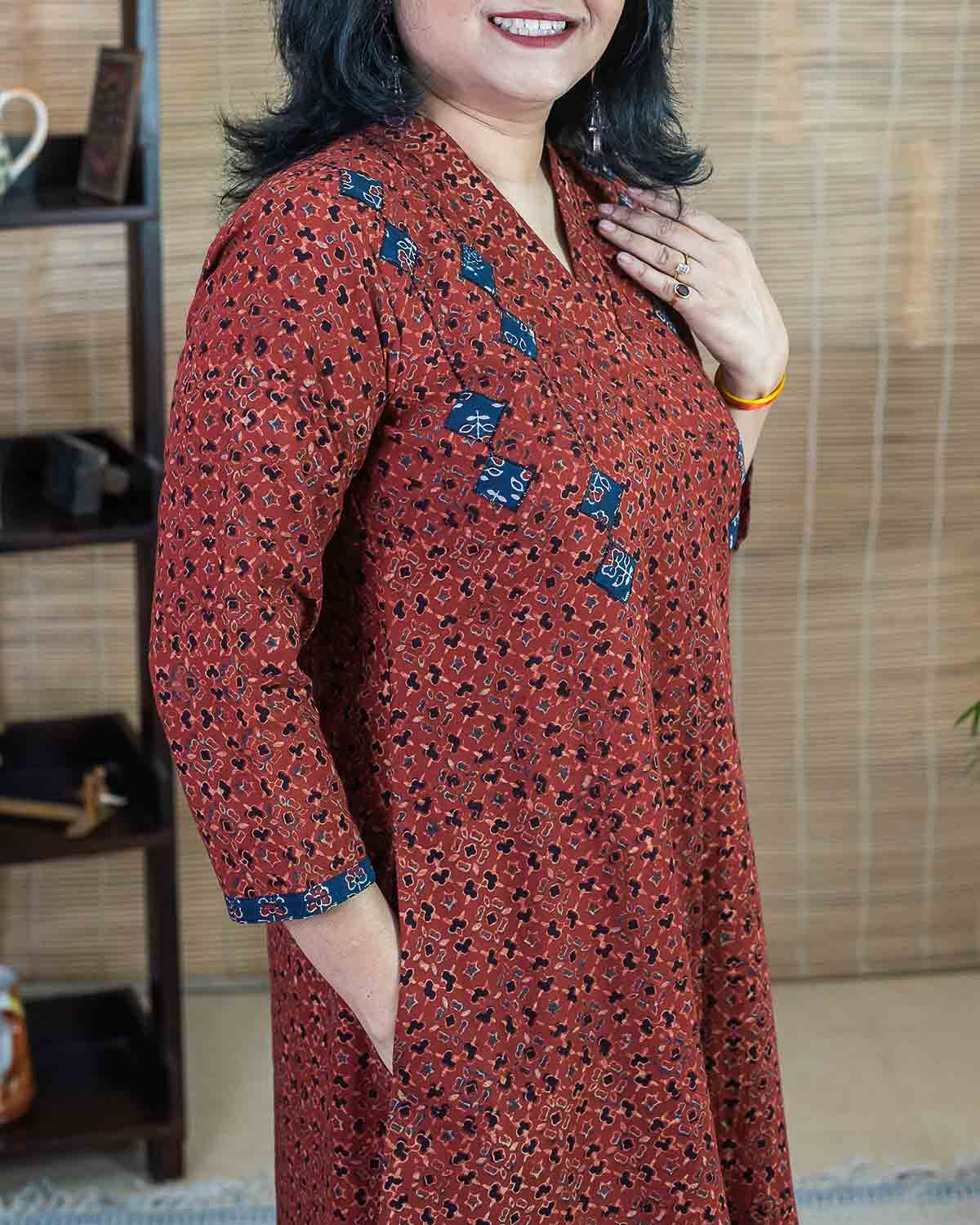 Signature slub cotton with ajrakh hand block printed motif with contrast ajrakh indigo applique work in the front. Dress cum Kurta with 1 side pocket. 3/4th sleeves with contrast indigo border.