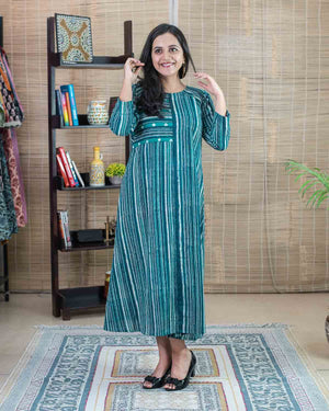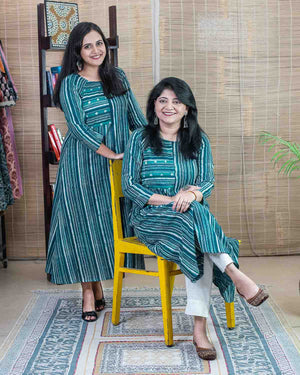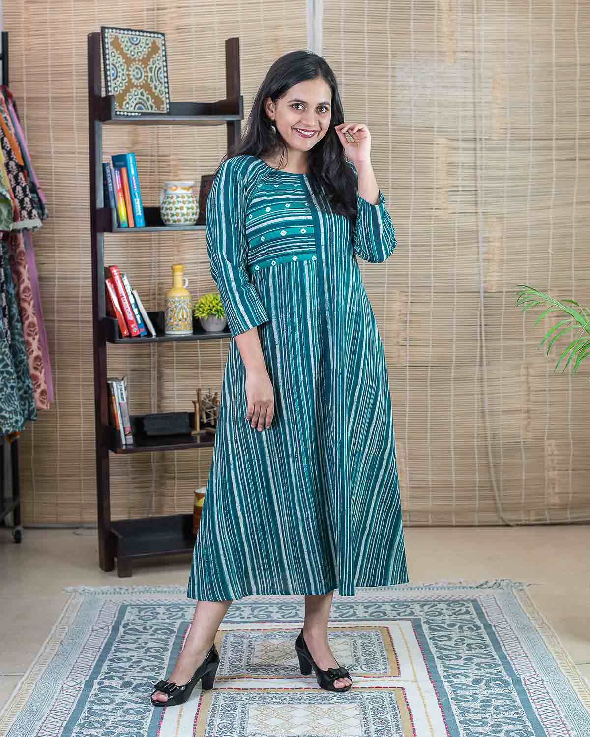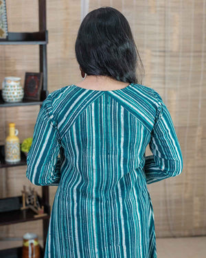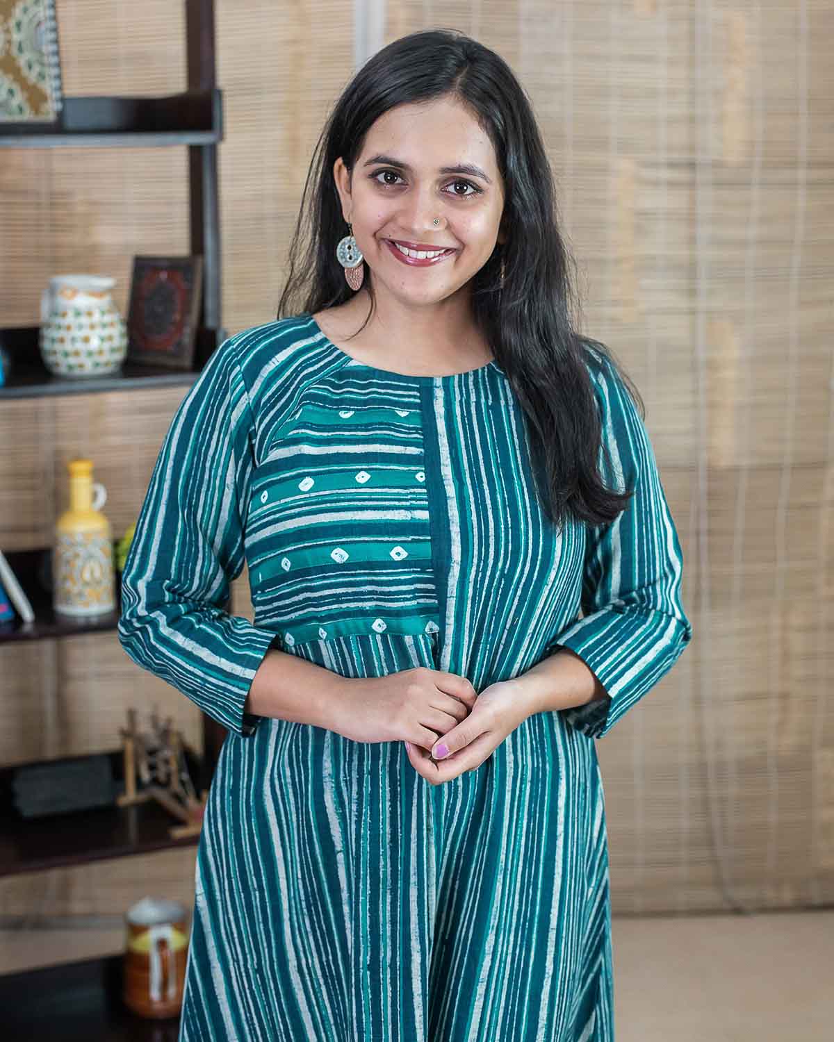 Product made from our signature hand block printed fabric, Slub cotton, striped in rama green and indigo color. To highlight we have used a patchwork of bandhej in the front. Rangler cut in the front and the back. Dress/Kurta with one side pocket.