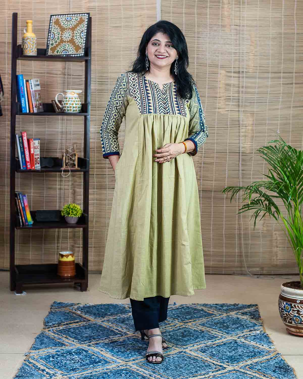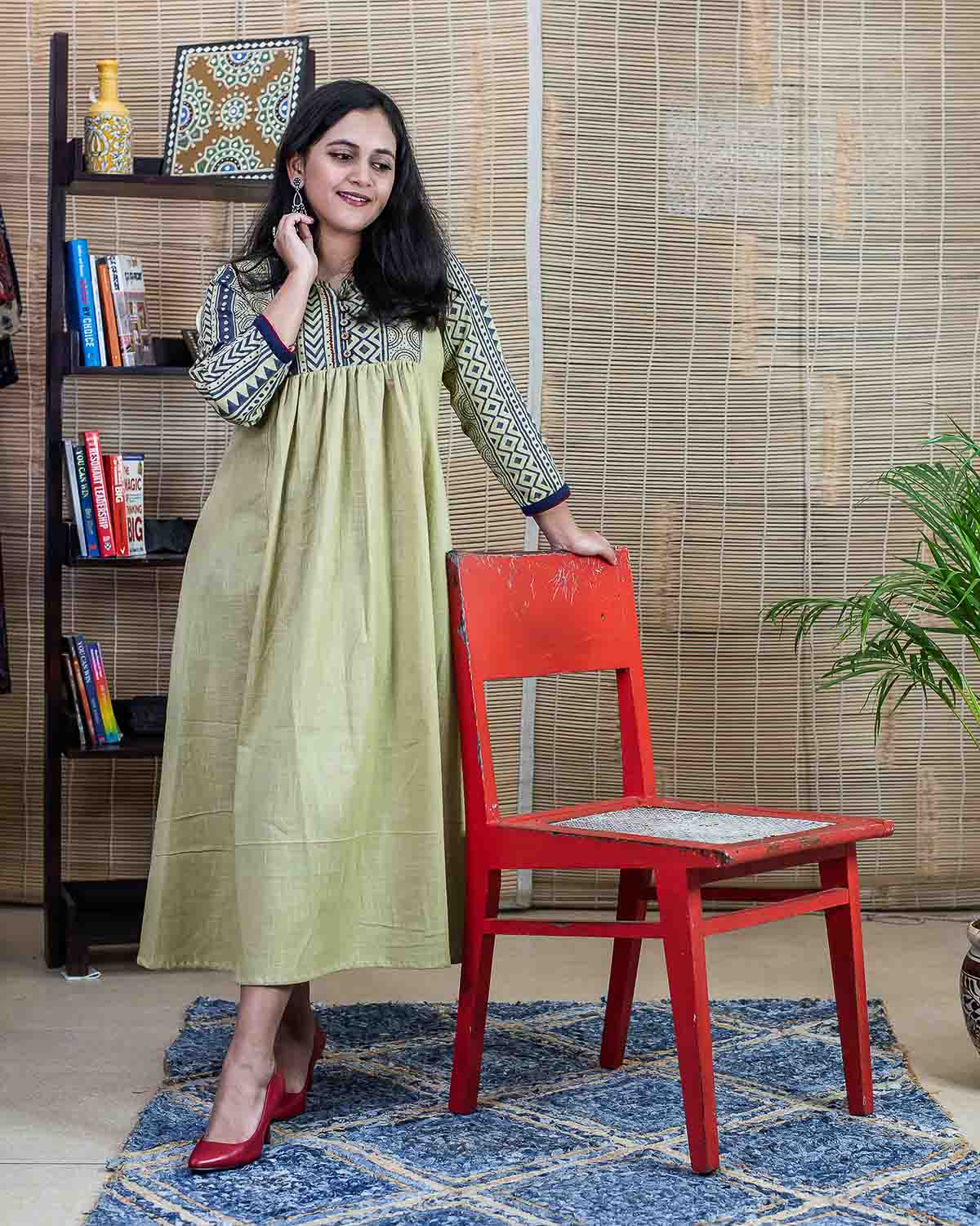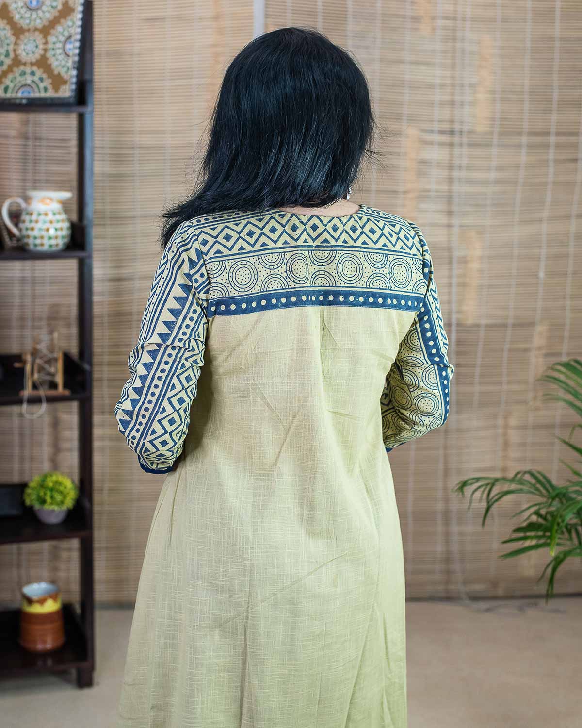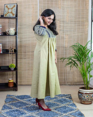 Product made from our signature hand block printed fabric, Slub cotton in unique beige color (with slight green tinge which makes it unique). Patterned with our signature indigo borders slub fabric for the sleeves and a front and back pattern. Comfort fit, perfect for summer. Long dress/kurta with a pleats pattern in the front, one side pocket. Contrast red elegant highlighter embroidery for the front pattern.