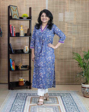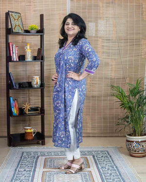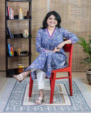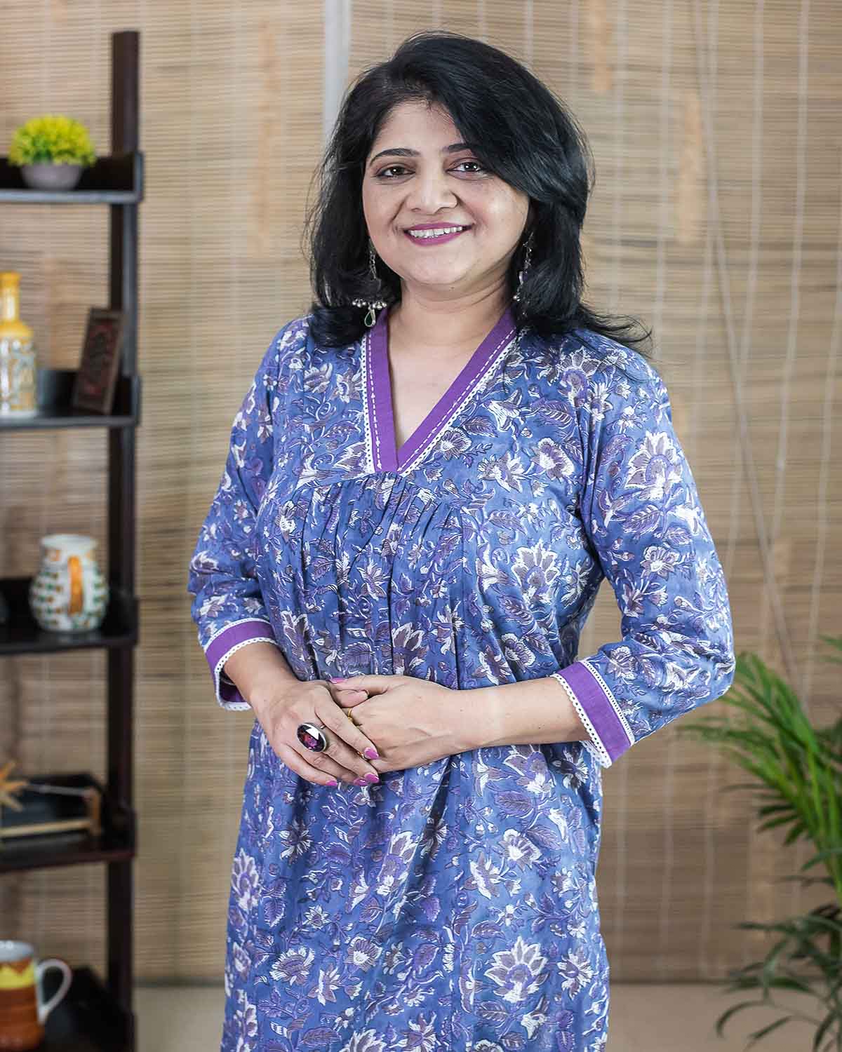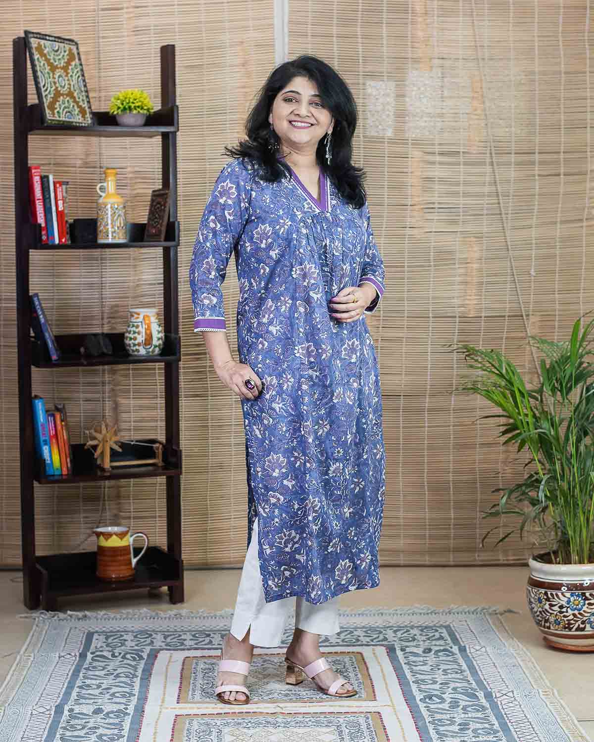 Suti, a soft cotton straight fit comfortable kurta with hand block print. Pleat detailing in the front. Hand work around the neck. Contrast piping of purple plain with ladder lace around the neck and sleeve.