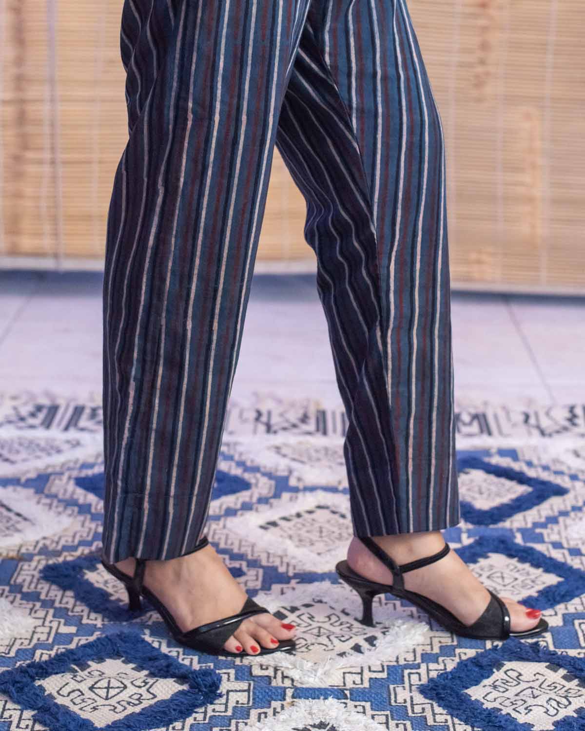 Elegant hand-block printed striped Ajrakh Trouser / Pants in Indigo color. It is a comfortable bottom wear which can be used with short tops or Long kurtas.