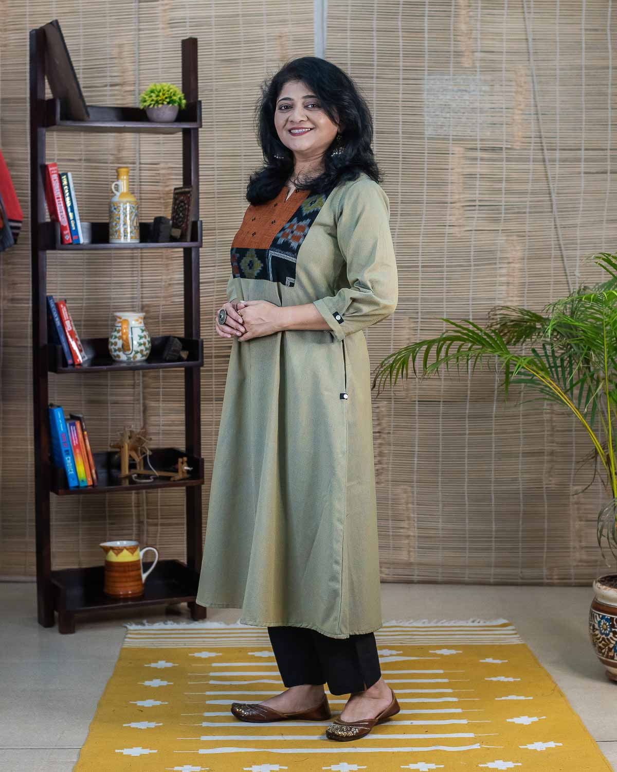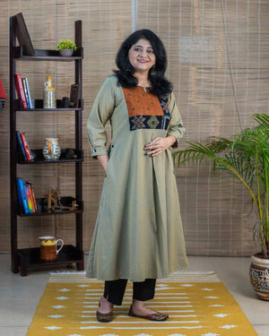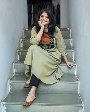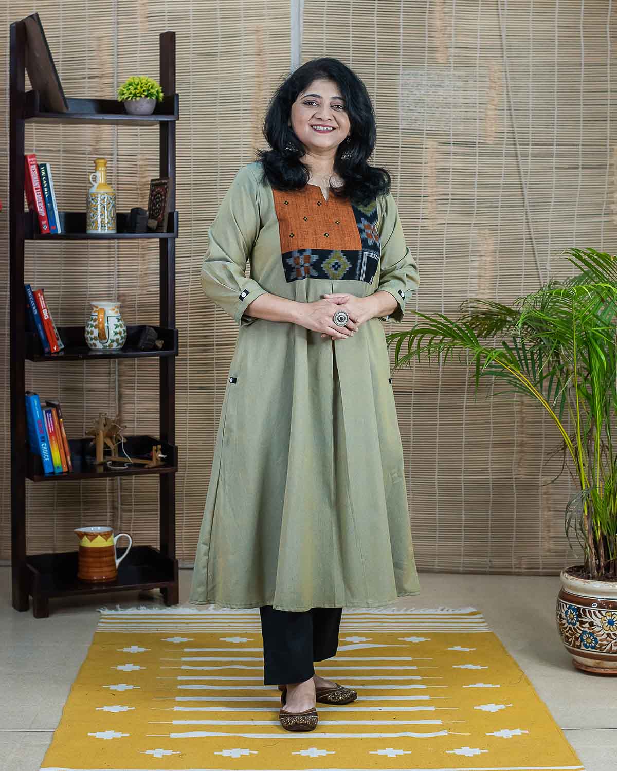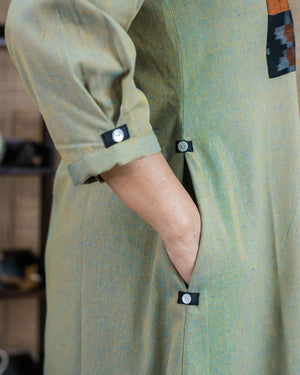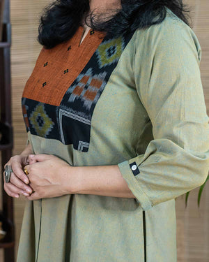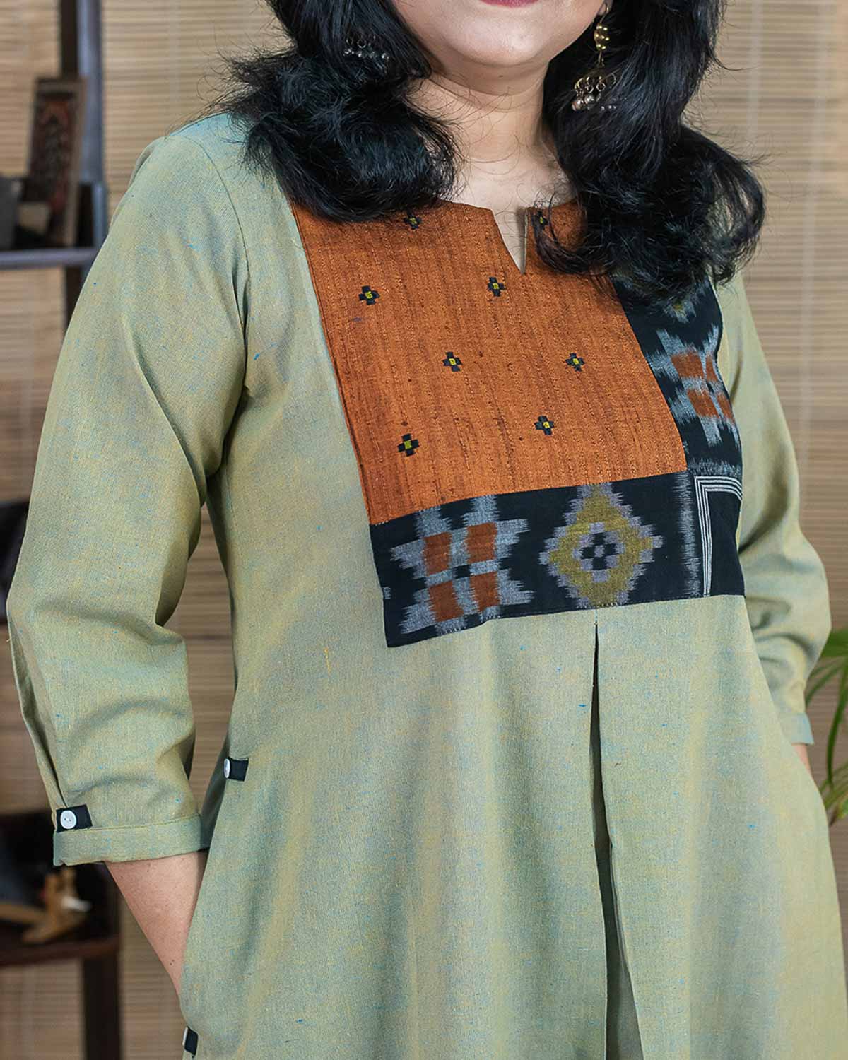This is a special product – Exclusive dress cum kurta with rare find exclusive Telia ikkat woven patchwork in the front with contrast orange cotton silk with embroidery Pleat in the front for comfort fit. 3/4 th sleeves. Special pattern of contrast black and buttons for the sleeves & around 2 side pockets. Main fabric is pure cotton.