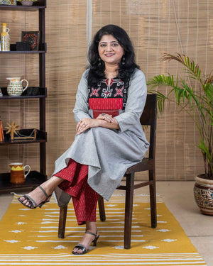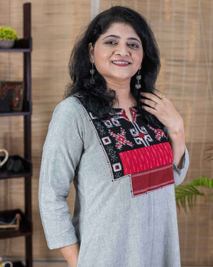 This is a special product – Exclusive dress cum kurta with rare find exclusive Telia ikkat woven patchwork in the front with sambalpur ikkat. Highlighted with hand embroidery.