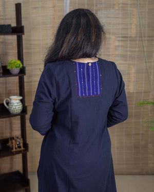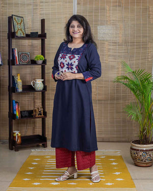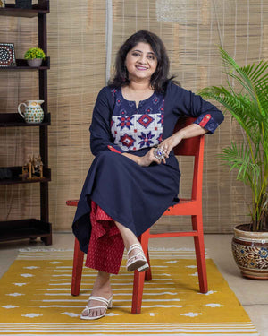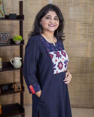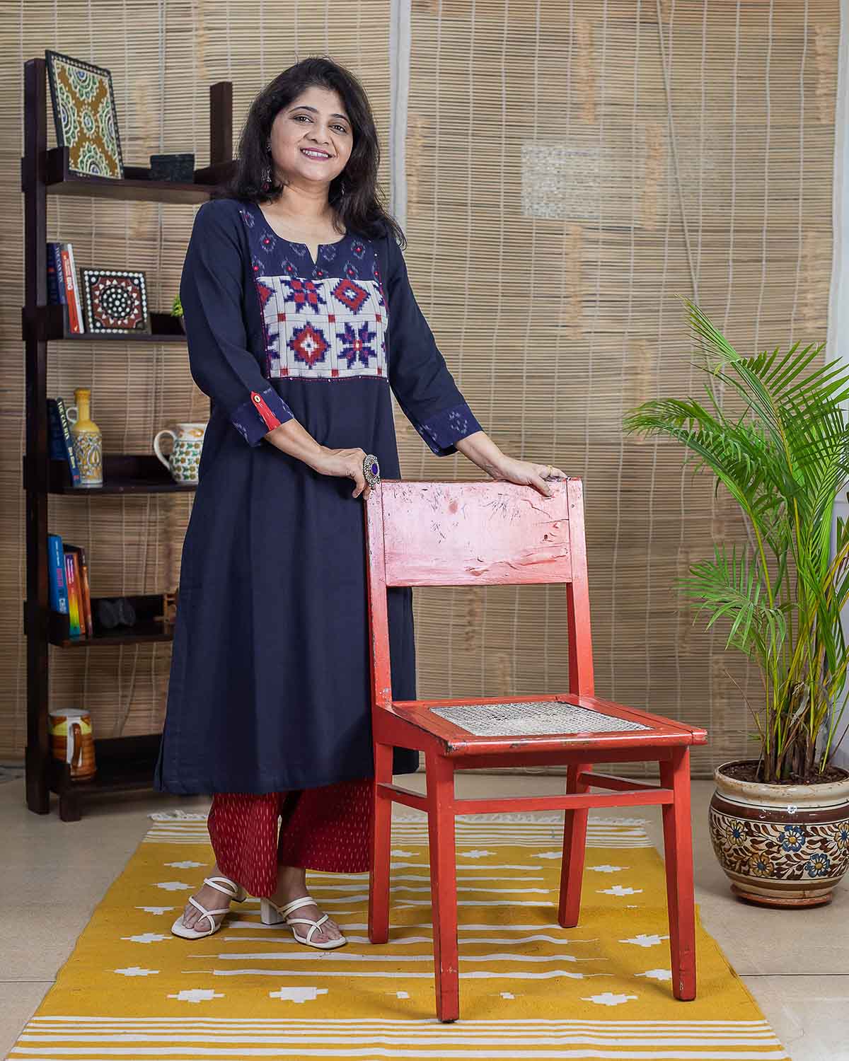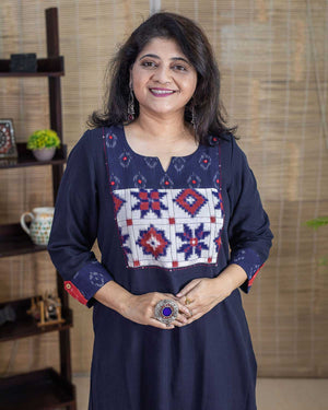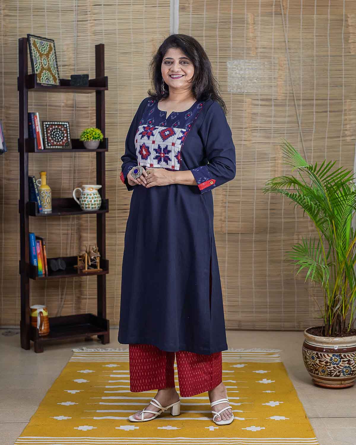 Special product - Exclusive designer Ikkat telia patchwork in the front and back with handwork. Main kurta fabric is superior cotton slub. A line kurta with side slits and a side pocket. Sleeve pattern with wooden button. Matching ikkat trouser is available as a separate product. Not included with this product.