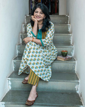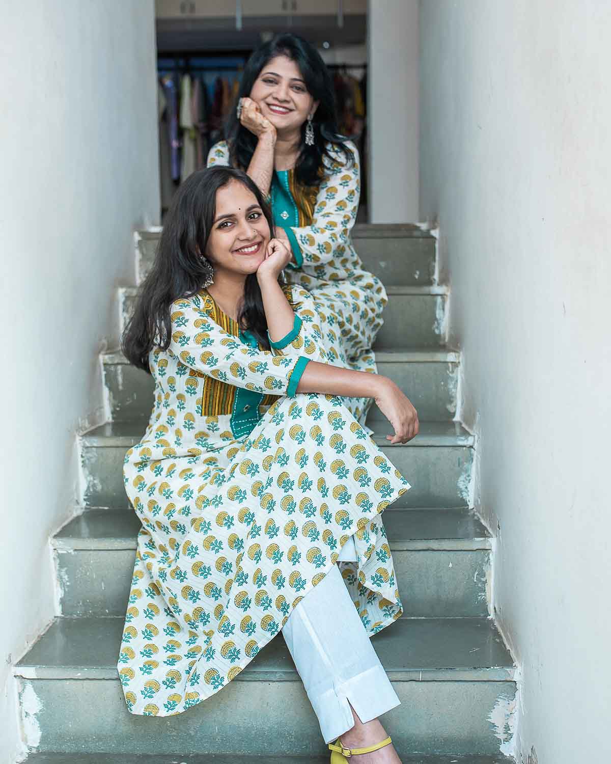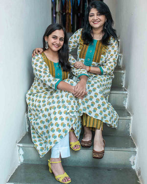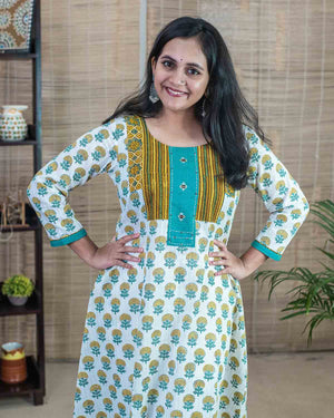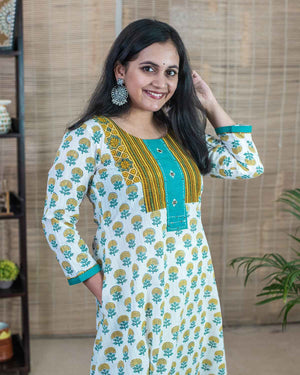 Signature fabric - Lurex (pure cotton infused with metalic golden lines) White & yellow combination hand block printed Dress cum Kurta. Ajrakh with hand embroidery pattern in the front. It has a Mughal butta hand block printing. 1 side pocket.