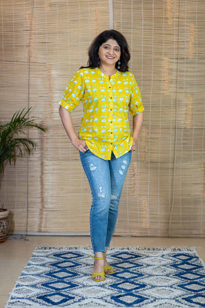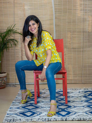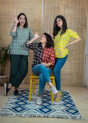 Exclusive in-house design. Wear this Signature Collection “Bachpan” hand block printed cotton top with a fitted pant / jeans. With Sleeves (Till elbow) Short top.
