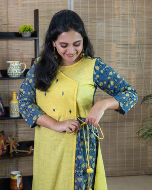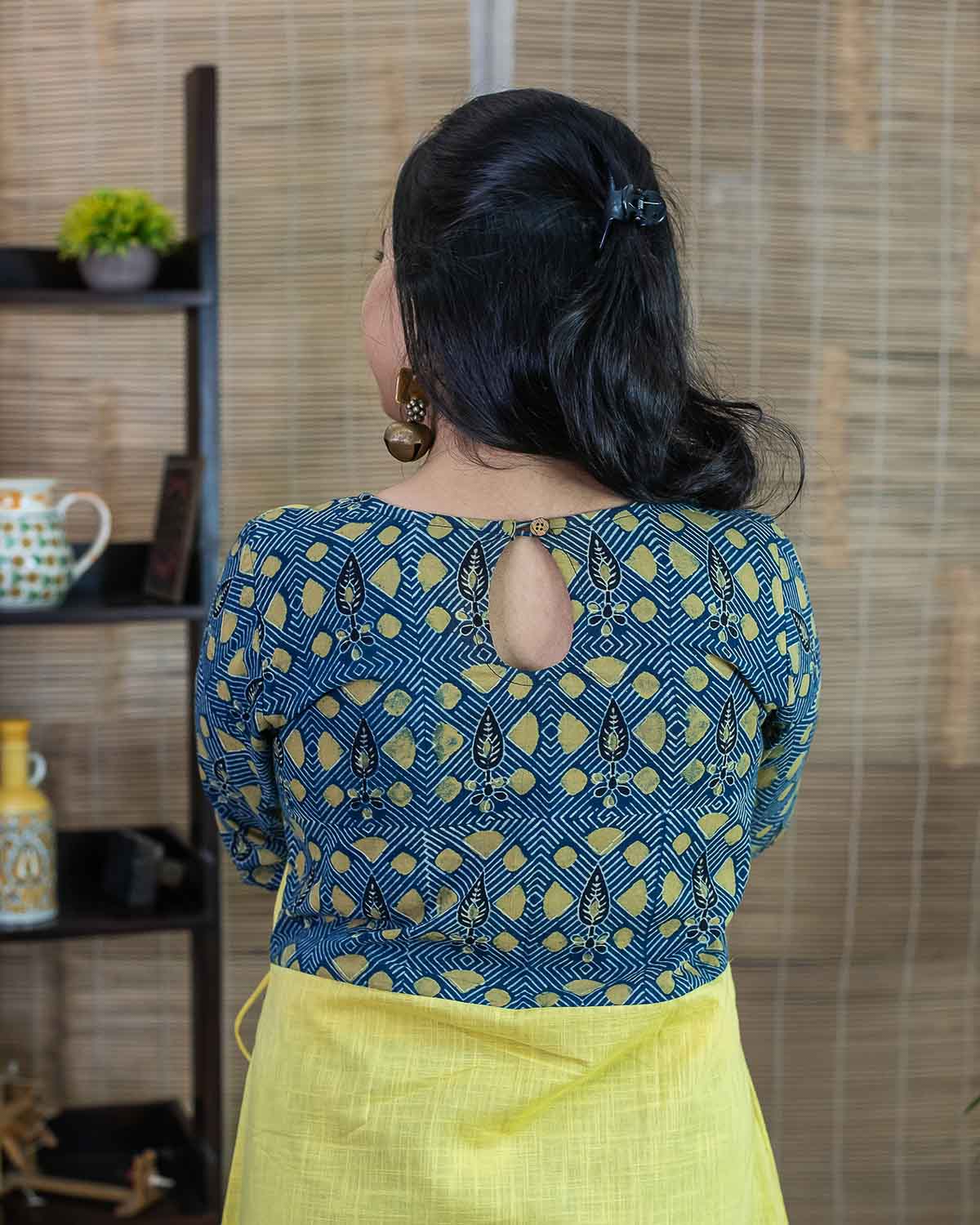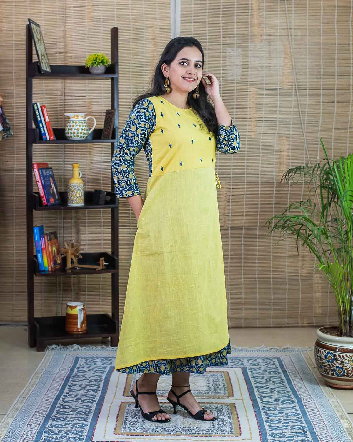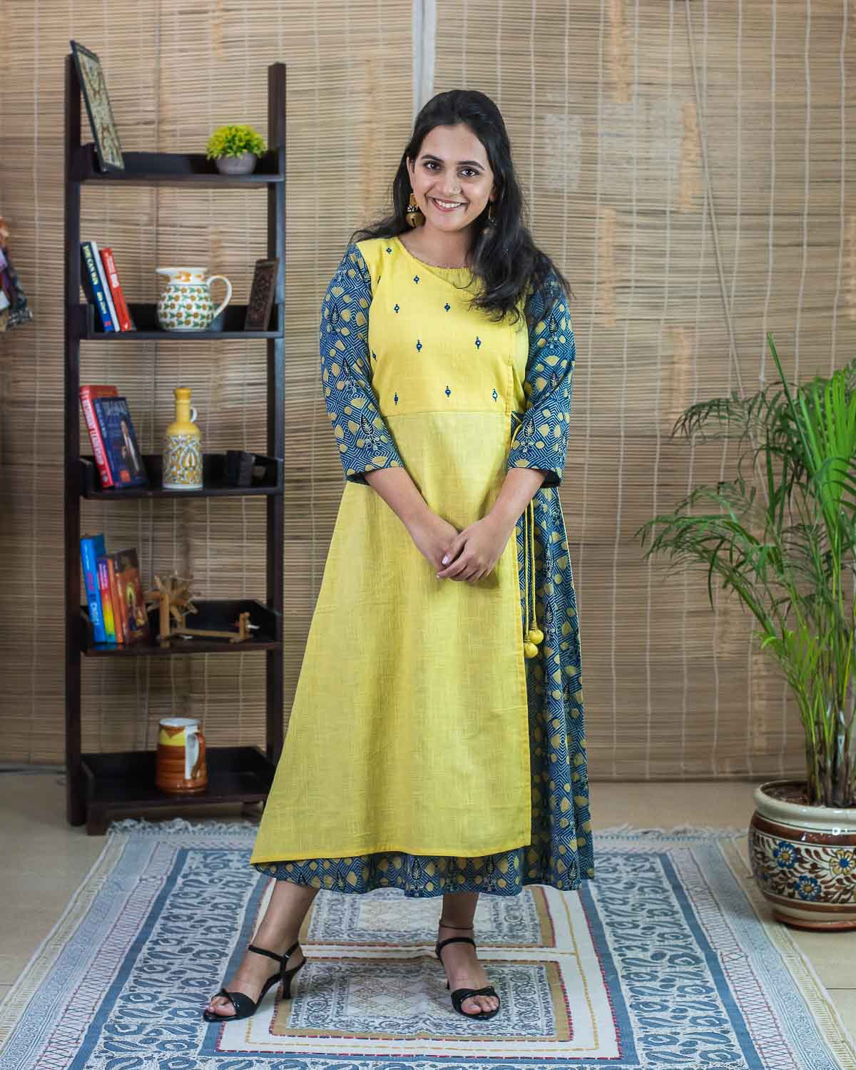 Beautiful yellow pure cotton slub with vegetable dye Ajrakh indigo dress cum kurta. Highlighted with machine & hand embroidery.