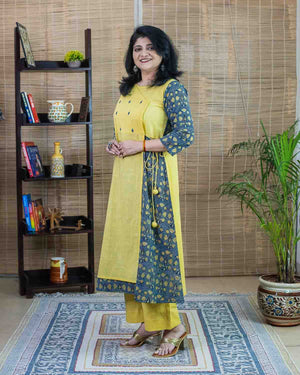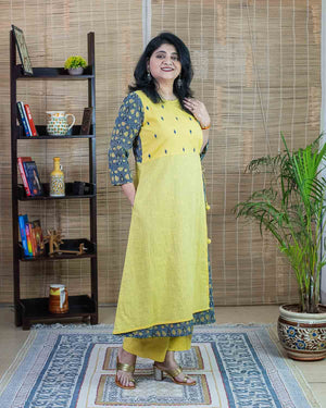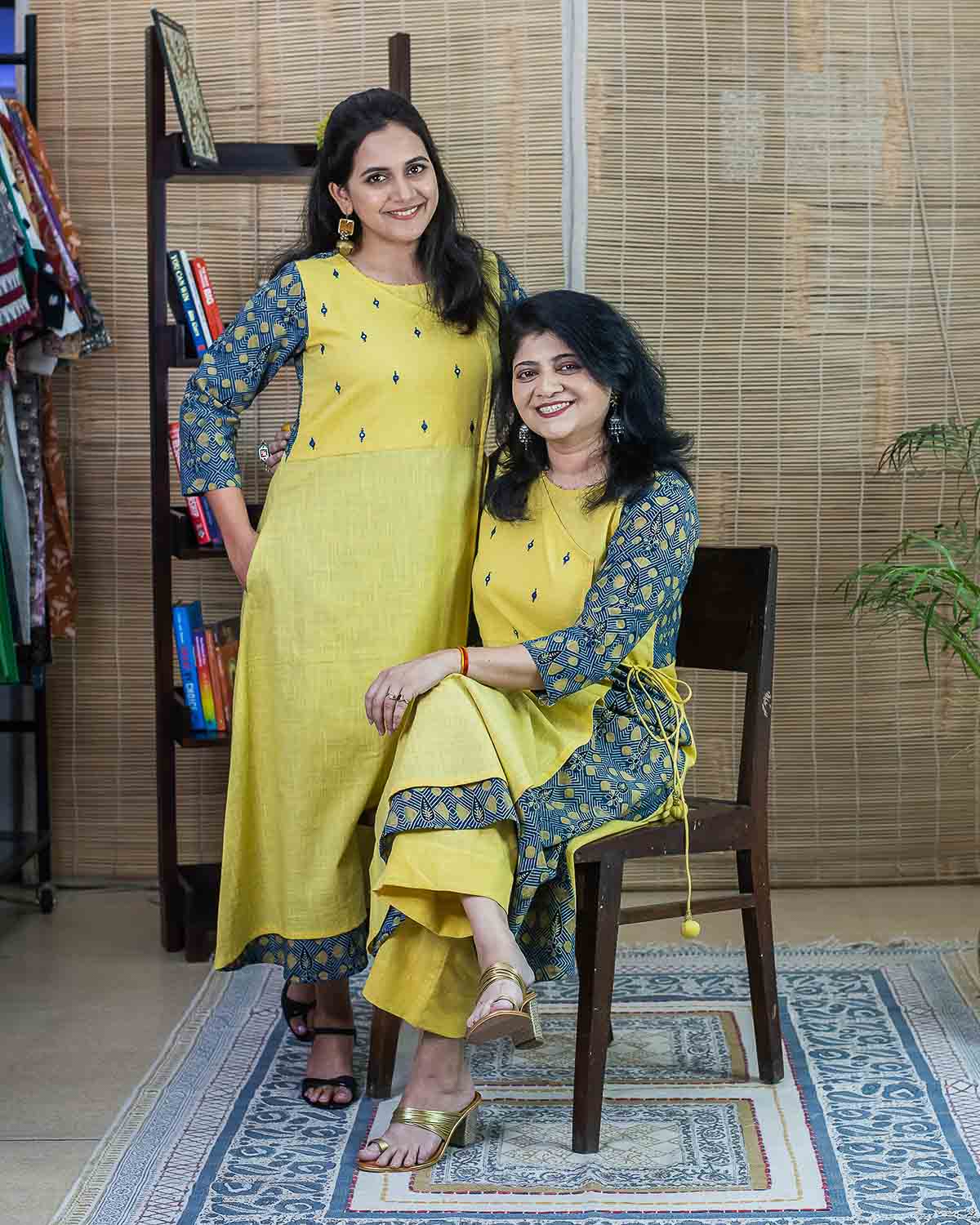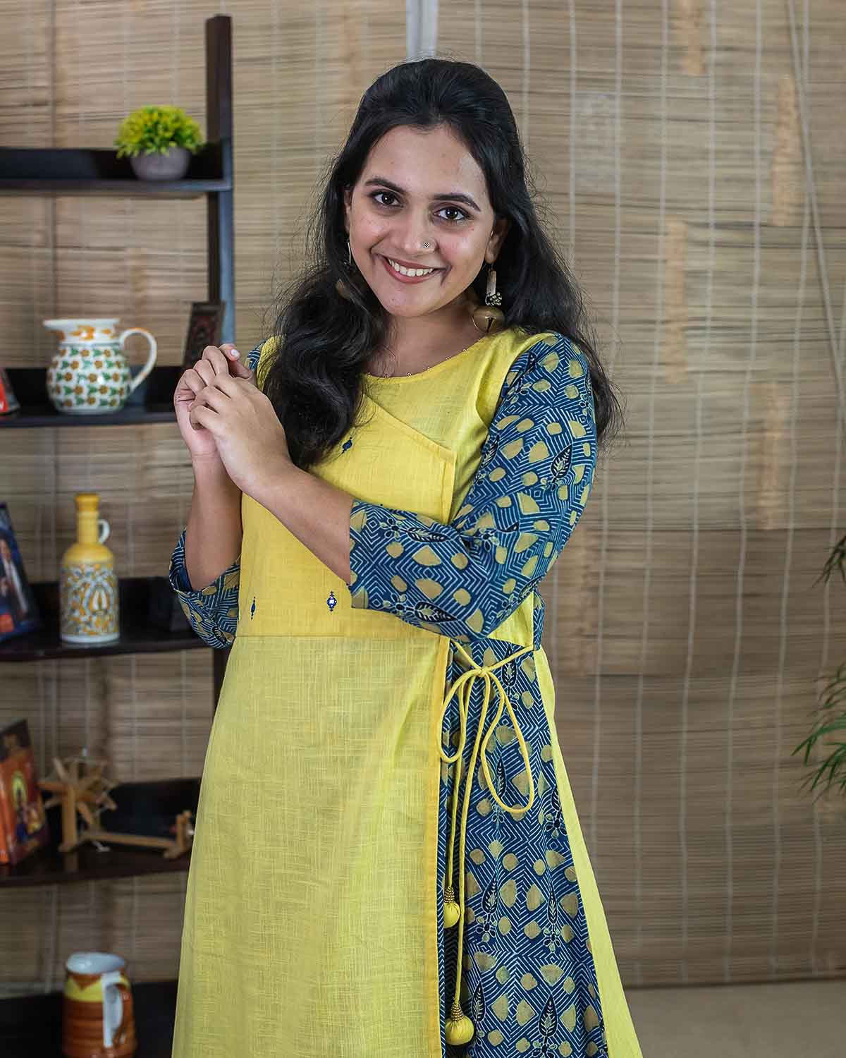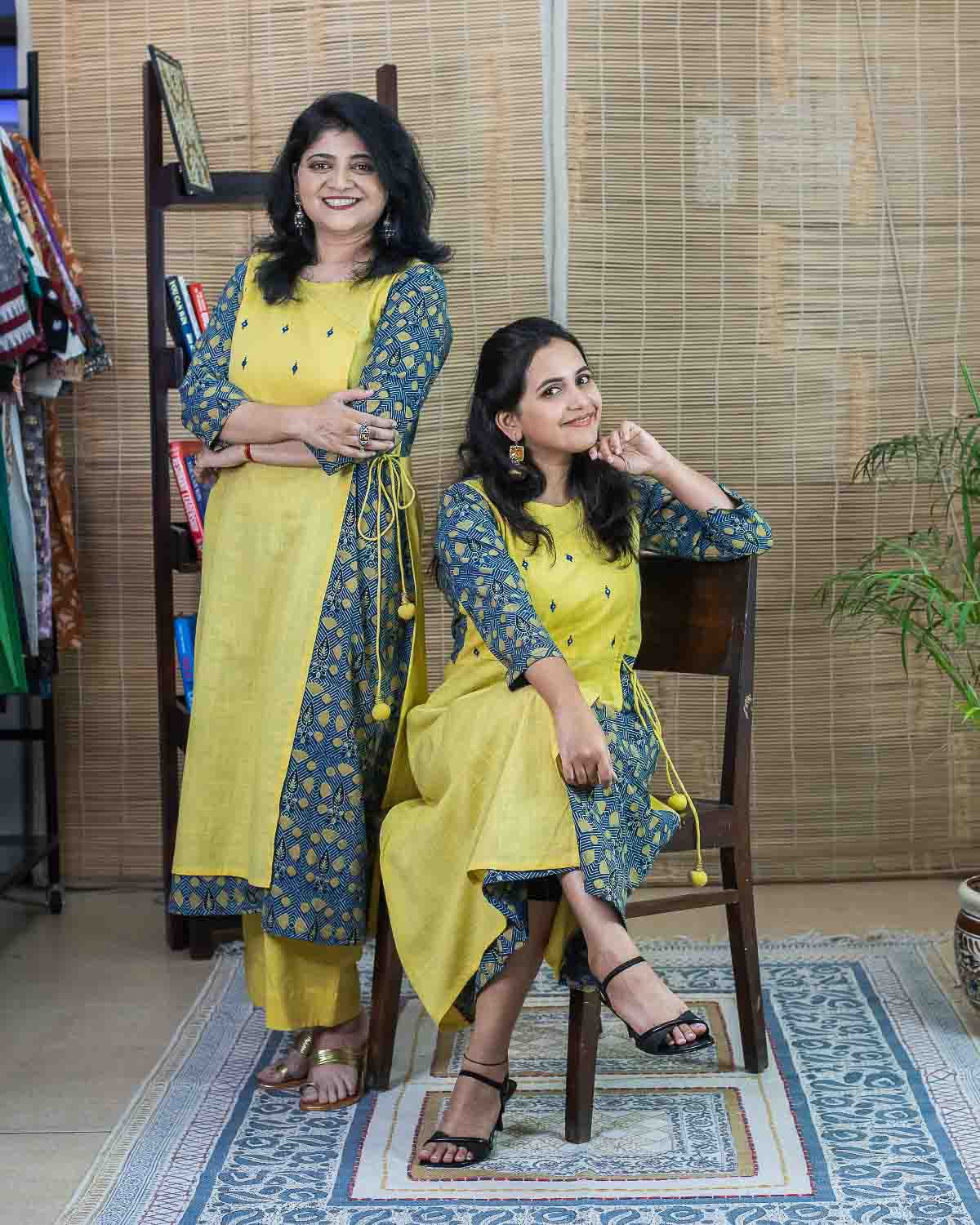 Beautiful yellow pure cotton slub with vegetable dye Ajrakh indigo dress cum kurta. Highlighted with machine & hand embroidery.
